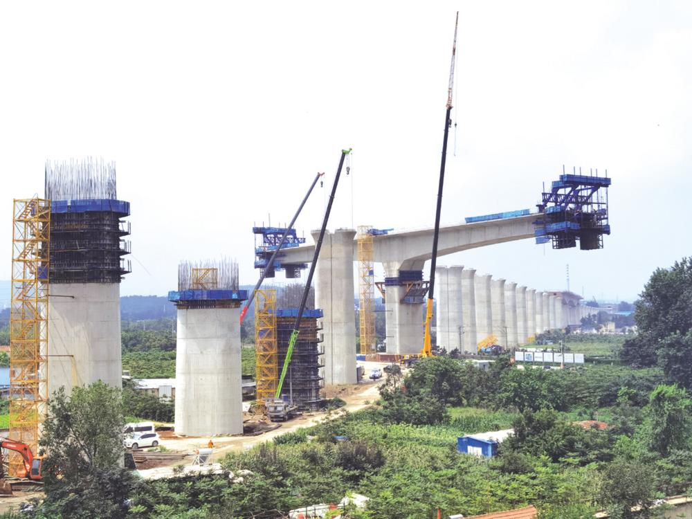 入伏后,气温逐渐升高,潍烟高铁只楚街道西牟段施工现场一片火热。一座座特大桥桥墩高高耸立,呈东西走向的潍烟高铁只楚段骨骼脉络已清晰呈现在众人眼前。