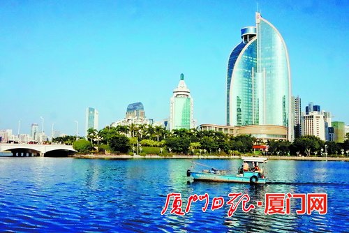 ▲昨日,一艘保洁船在筼筜湖上作业。(厦门日报记者 吴海奎 摄)
