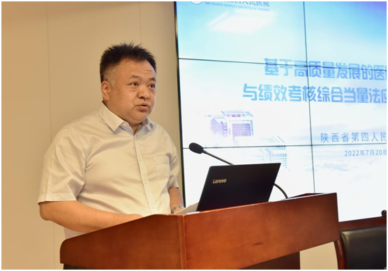 院党委书记郭亚东在会上宣读了《陕西省第四人民医院基于高质量发展的医院战略规划与绩效考核综合当量法应用研究项目实施方案》,他从方案从指导思想和总体要求、组织领导、项目内容、工作步骤、工作要求等5方面就相关工作做出详细安排部署。他强调,本次召开基于高质量发展医院战略规划与绩效考核综合当量法应用项目启动工作全院职工要提高认识,高度重视,将工作做细做实,广泛征求职工意见,全员参与,结合医院实际,充分调动职工的积极性,制定出切实可行、具有陕西省第四人民医院特色的战略规划与个性化绩效方案。发挥绩效管理工作“指挥棒”“风向标”作用,切实推进医院发展布局,打造医院核心竞争力。