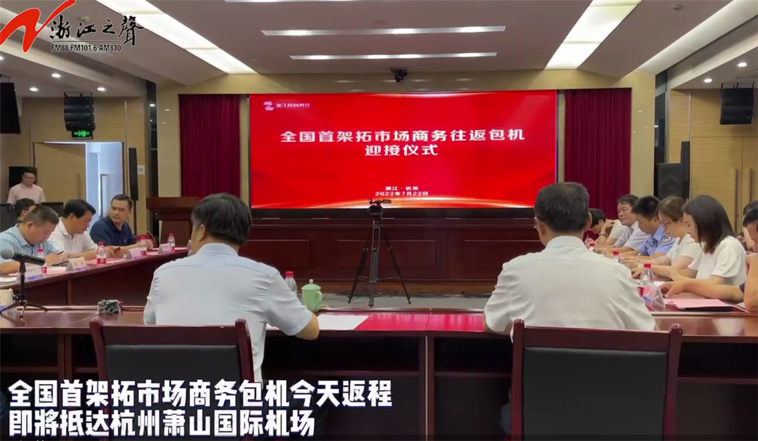 中午12点半左右,省商务厅主会场、宁波市分会场与航班团组成员实现空地连线,共同举行欢迎仪式。