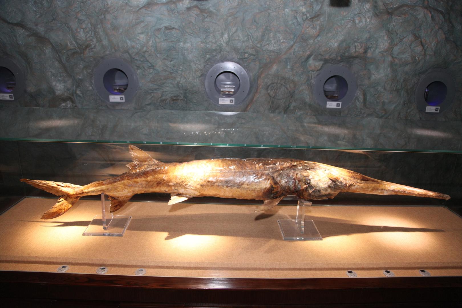 ↑2019年12月13日,武汉,中科院水生生物研究所水生生物博物馆内的白鲟标本。