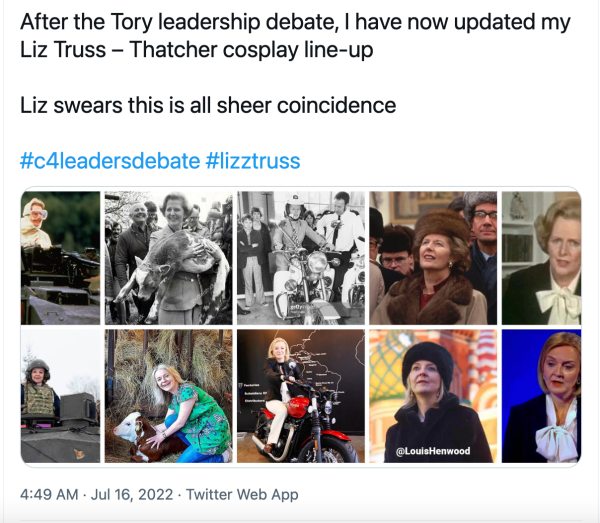 几个月来,特拉斯的不少照片都被指在“扮装”玛格丽特·撒切尔,包括在爱沙尼亚坐“挑战者-2”坦克,在泰国坐凯旋摩托车,在约克郡拥抱一头小牛。有推特网友发布了特拉斯15日的着装与撒切尔夫人参加1979年大选时着装的对比图,称特拉斯“‘从头到尾’再现了1979年大选直播时玛格丽特·撒切尔的形象”,截至目前,该条推文已获赞1.4万多次,并被超过三千人转发。无论是不是有心模仿,这些举动实质上已为她在保守党内赢得了一些支持。一位前大臣说:“保守党中的资深女性总是被拿来与撒切尔相比。她做得很好。这在党员中间效果不错。”