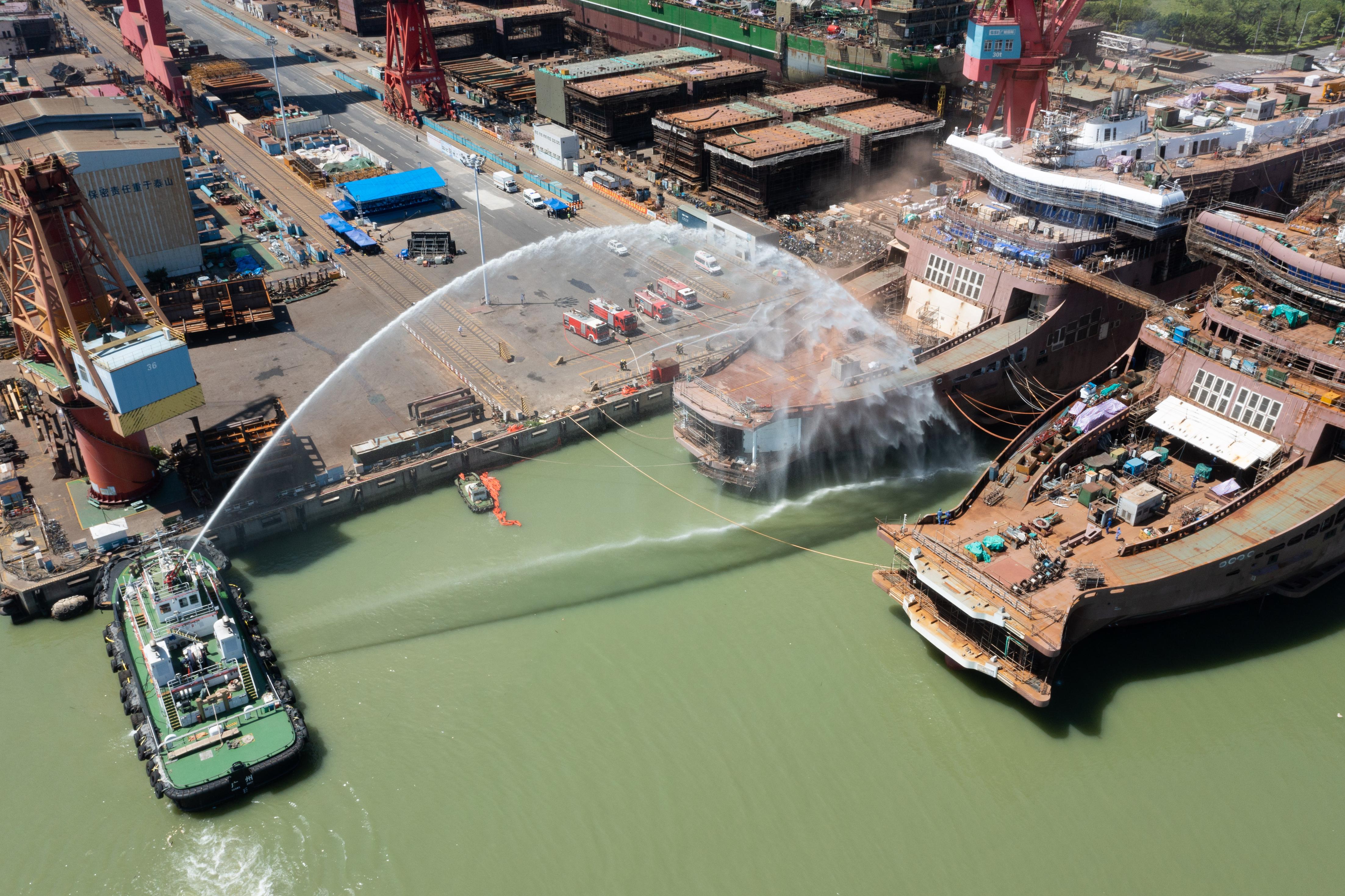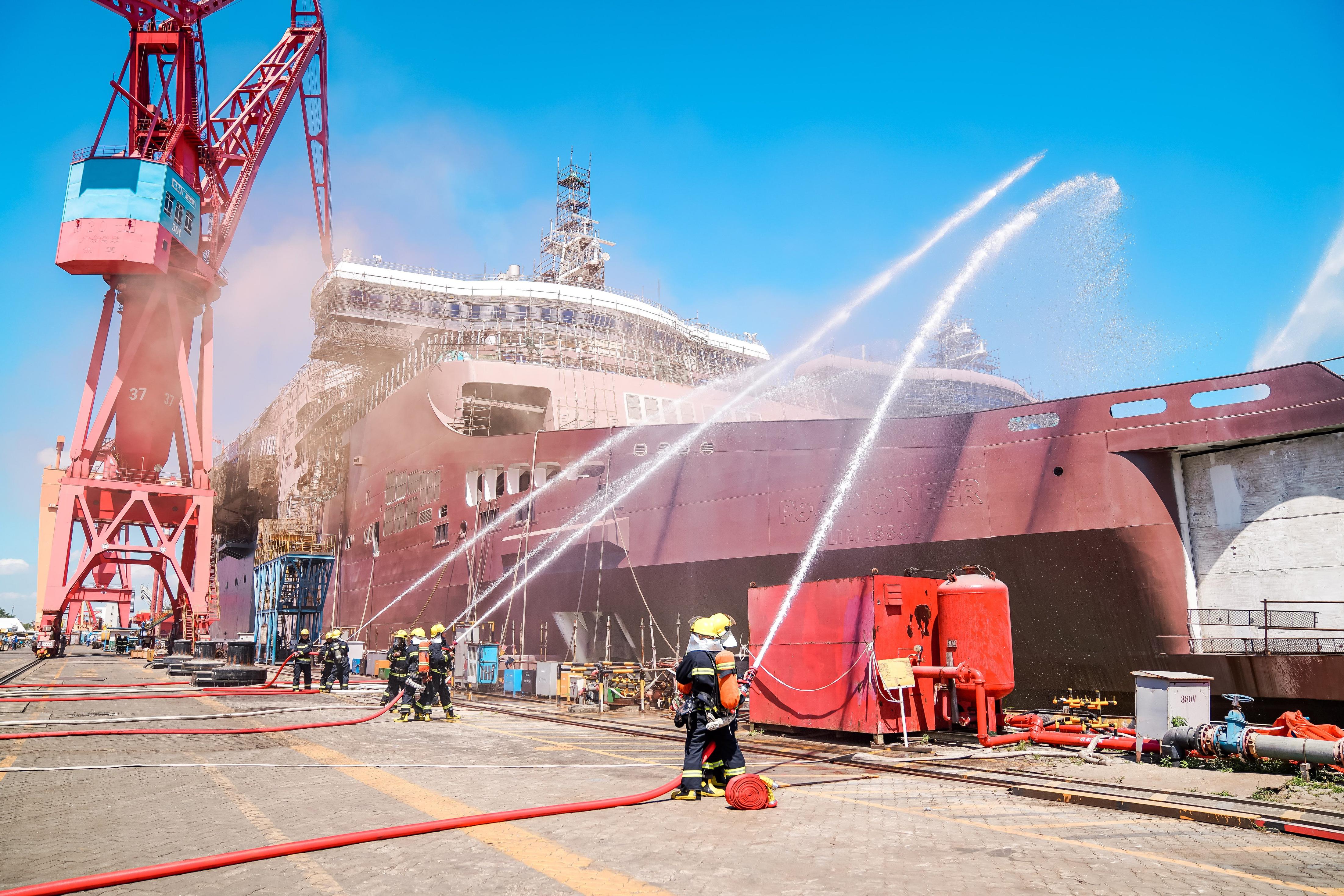 在建船只突发火灾,水上陆上联合救援!7月22日上午,广州市应急管理局和南沙区人民政府在广船国际有限公司组织开展2022年船舶制造业综合应急演练。