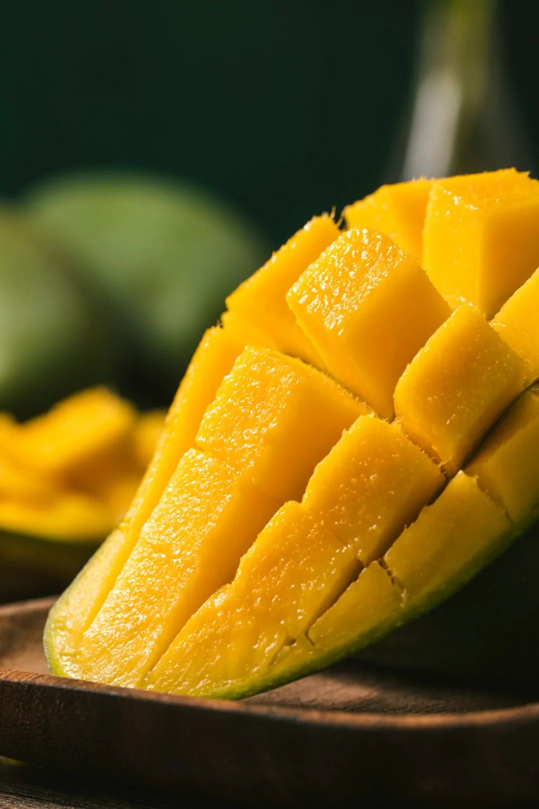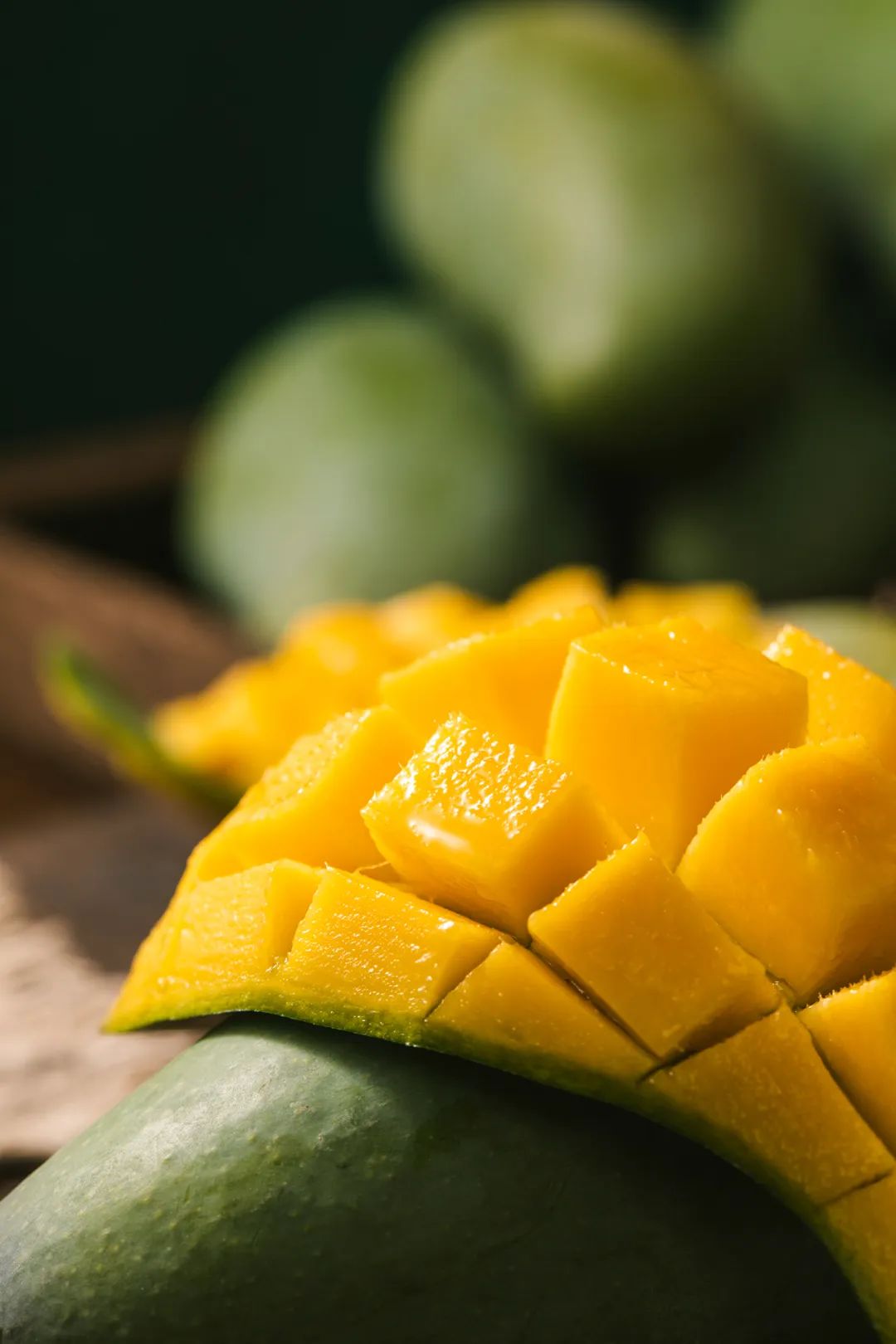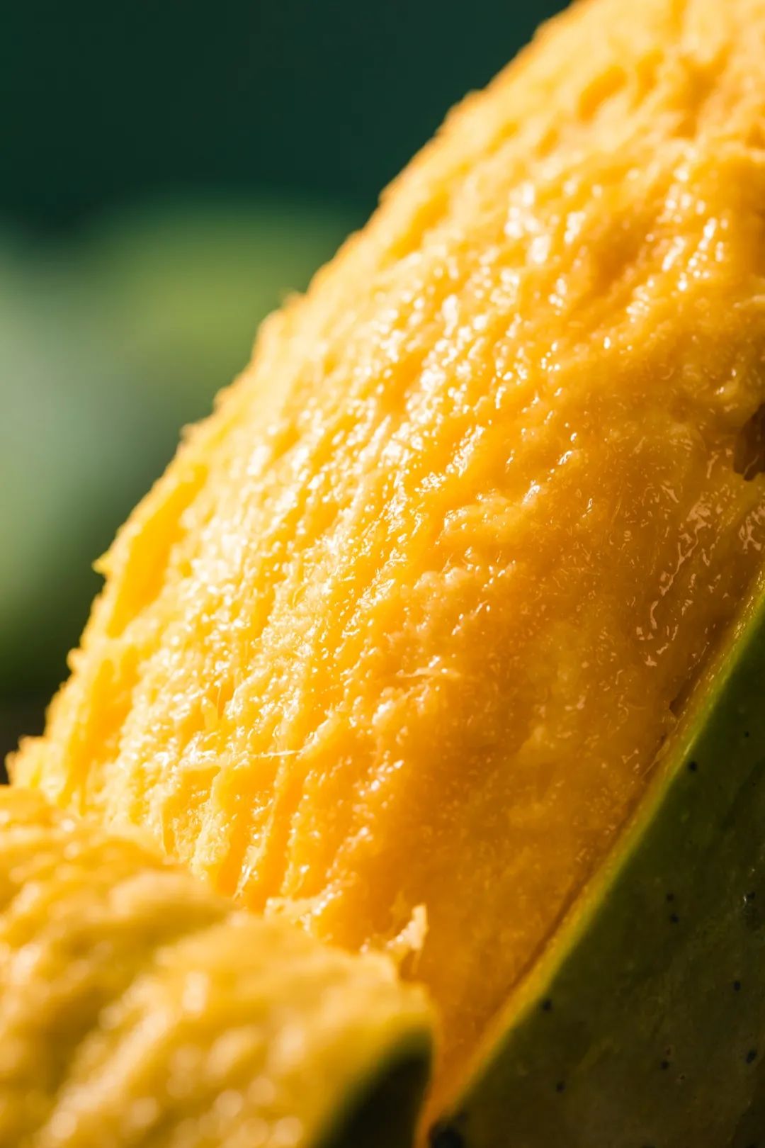 轻轻撕开它青色的果皮,馥郁的香气率先迸发,随即展露出与外表截然不同的金黄果肉,咬一口,丰盈的汁水在口腔中肆意横流,细腻的果肉融化在唇齿之间。说是芒果,但感觉却吃到了乳酪般的顺滑口感,蜜糖似的甜美味道。