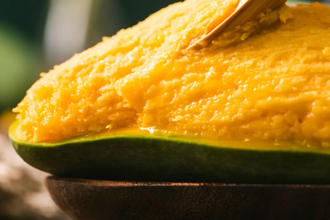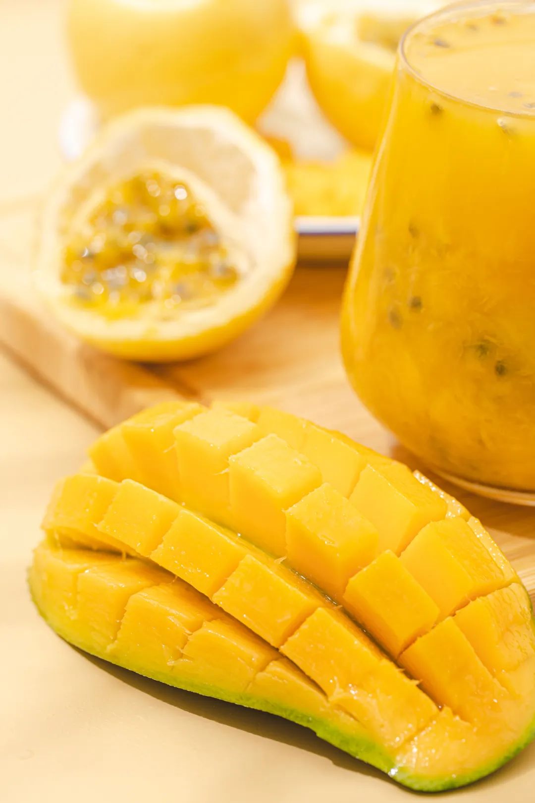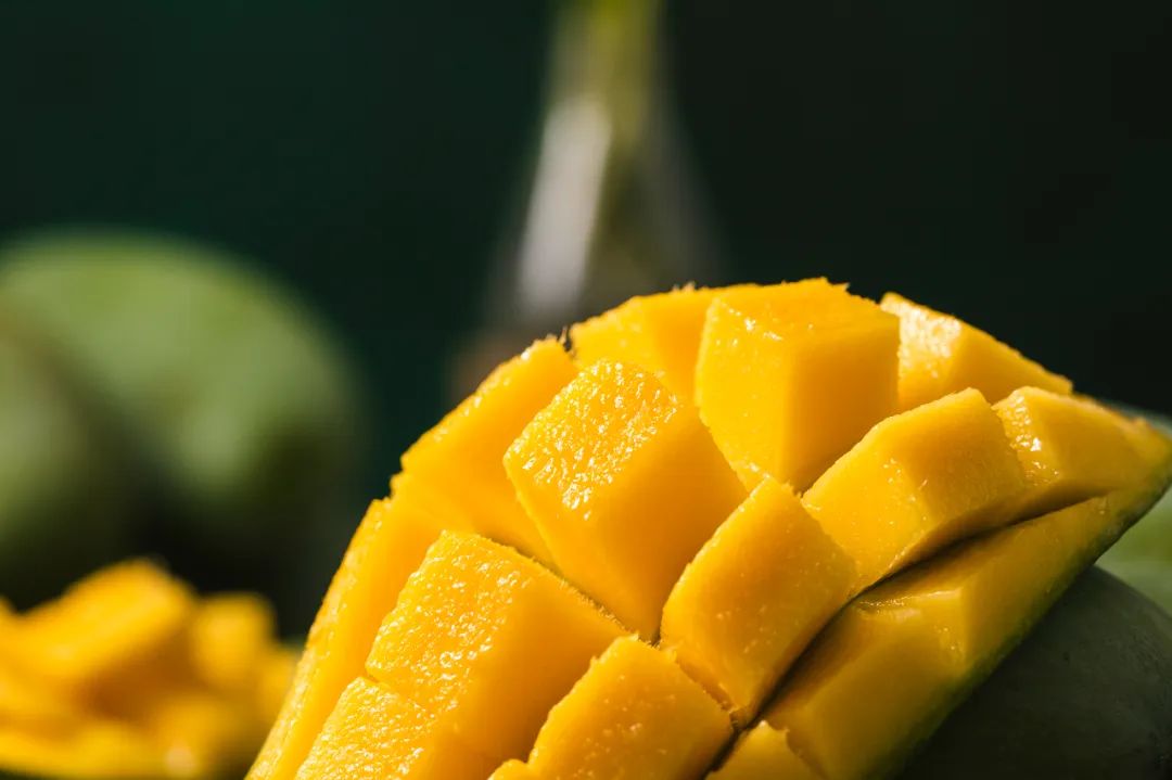 轻轻撕开它青色的果皮,馥郁的香气率先迸发,随即展露出与外表截然不同的金黄果肉,咬一口,丰盈的汁水在口腔中肆意横流,细腻的果肉融化在唇齿之间。说是芒果,但感觉却吃到了乳酪般的顺滑口感,蜜糖似的甜美味道。