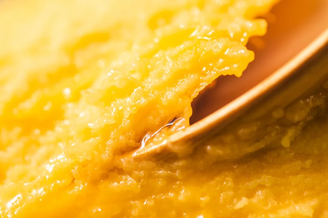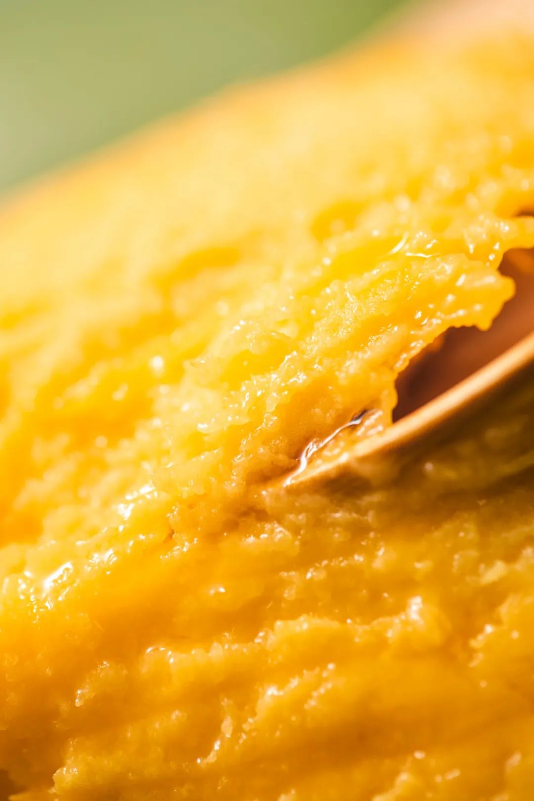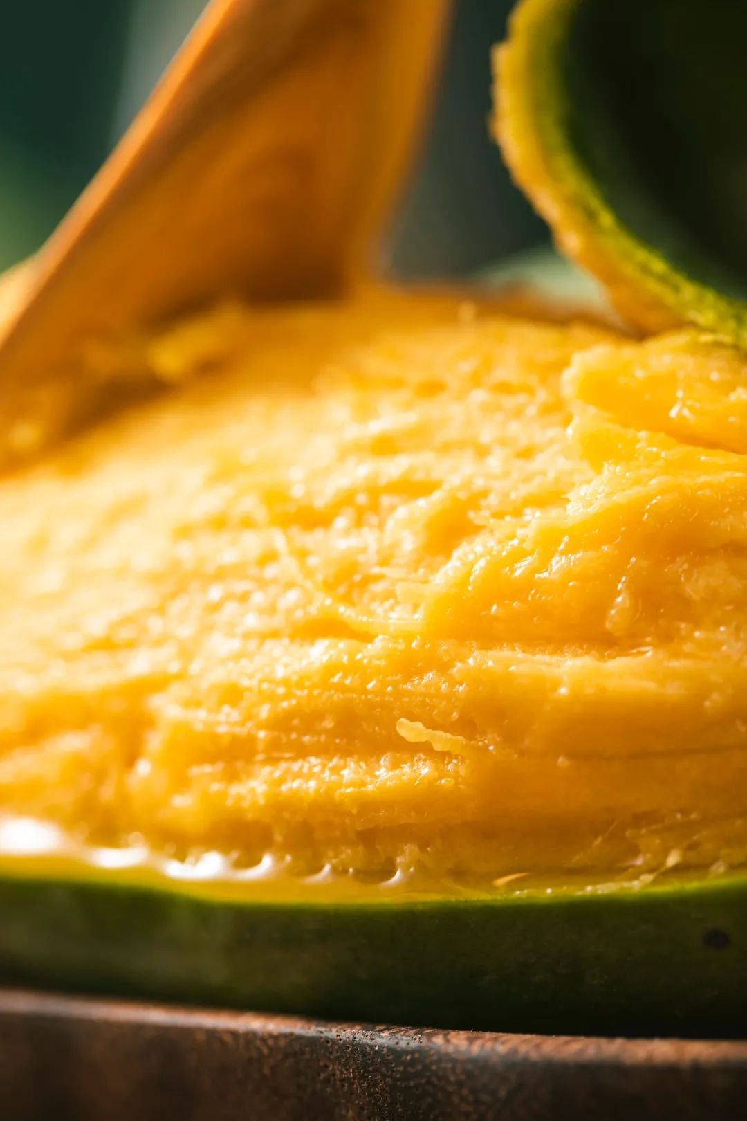 然后就是桂七芒的味道:等到剥开外皮,汁水四溢,触目尽是一片流动的金黄。深吸一口,细腻绵软的果肉滑入嘴中,能像乳酪一般直接用勺子挖着吃。