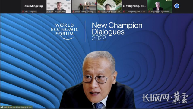 君乐宝乳业集团董事长兼总裁魏立华在世界经济论坛“2022年新领军者对话会”线上会议发言。