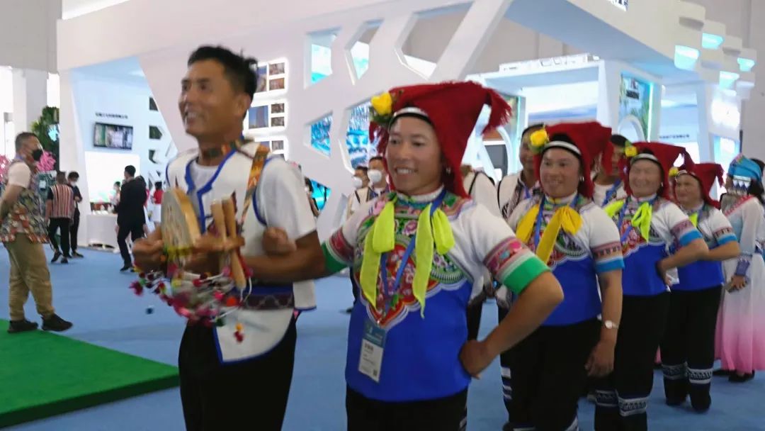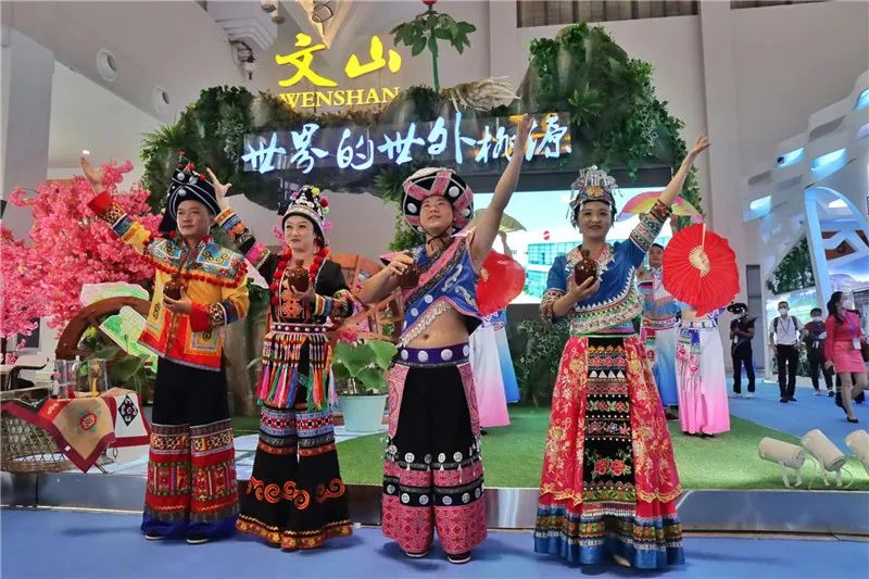 文山,就像她 “承接东西、贯通南北、通边达海”的独特区位优势,是包容开放的。当别的展台在家门口劲歌热舞,文山的舞者们却反其道而行之,他们两人一队,挽着手跳起欢快的弦子舞,在各个展厅间展示着文山省级非遗歌舞的魅力,沿路追捧者众。在展厅里采访、直播的媒体记者们也用镜头追随着这群欢乐自信的舞者。