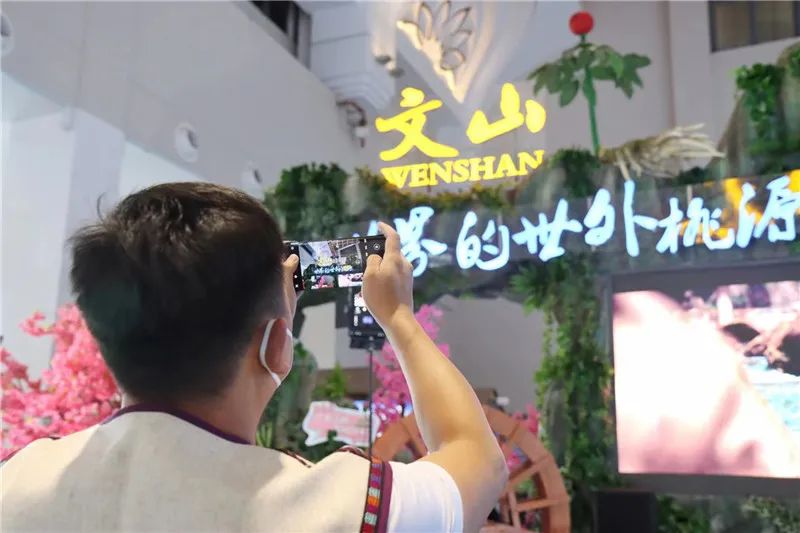文山的展台就像她的IP,极其原生态地安然于展厅一隅,山色青青、桃花灼灼。沿着水路似的玻璃小径走入洞中,普者黑的独一无二的大小洒锦并蒂莲或含苞或怒放。壮乡的竹编圆桌散放着几个草墩,来文山,就像回家,围桌而坐,喝泡老山古树茶,把玩一下砚山的玛瑙工艺品,聊聊这个夏天去哪里旅游。这个风格迥异的展位吸引了很多人的关注,来都来了,就在缩小版的三生三世十里桃花里打个卡吧。