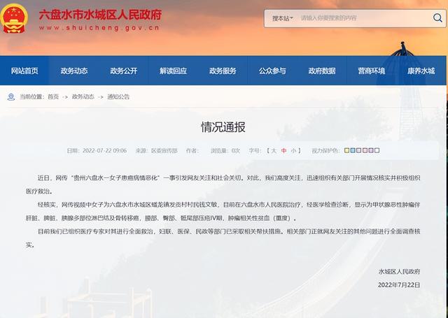 近日,网传“贵州六盘水一女子患癌病情恶化”一事引发网友关注和社会关切。对此,我们高度关注,迅速组织有关部门开展情况核实并积极组织医疗救治。