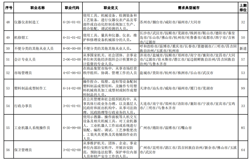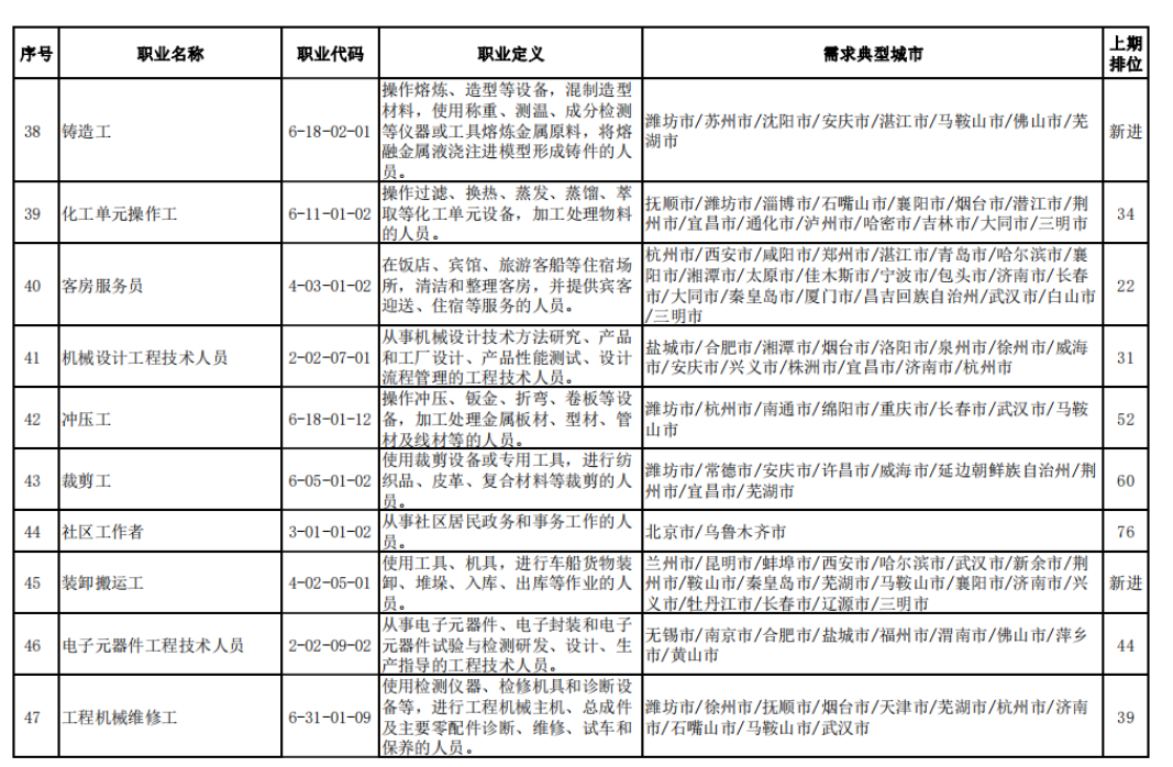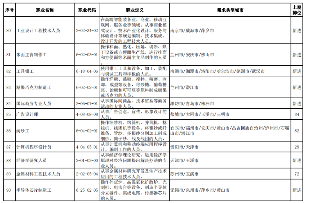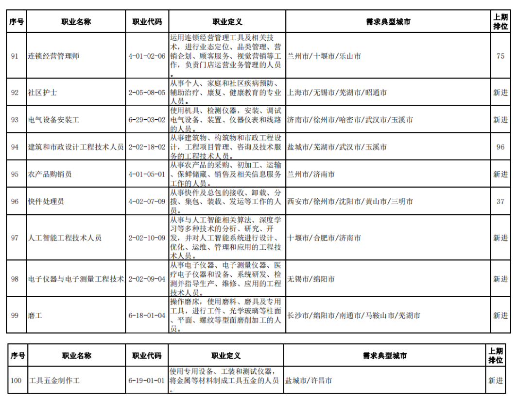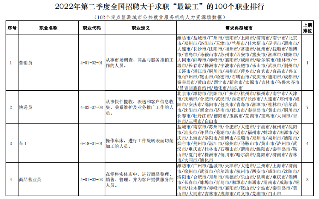 中国就业培训技术指导中心近期组织102个定点监测城市公共就业服务机构,收集汇总2022年第二季度人力资源市场供求关系较为紧张的招聘、求职需求职业岗位信息,形成“2022年第二季度全国招聘大于求职‘最缺工’的100个职业排行”,现向社会公布。