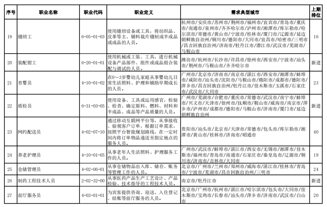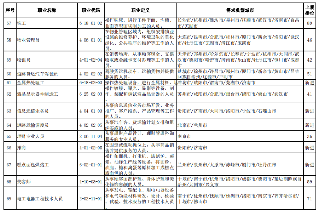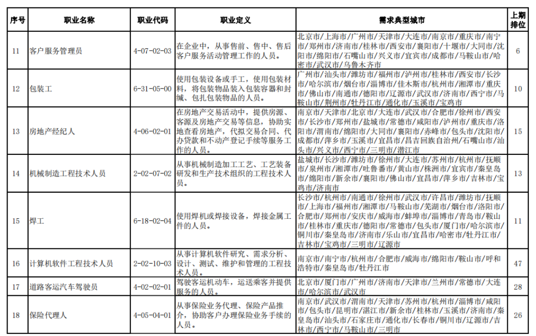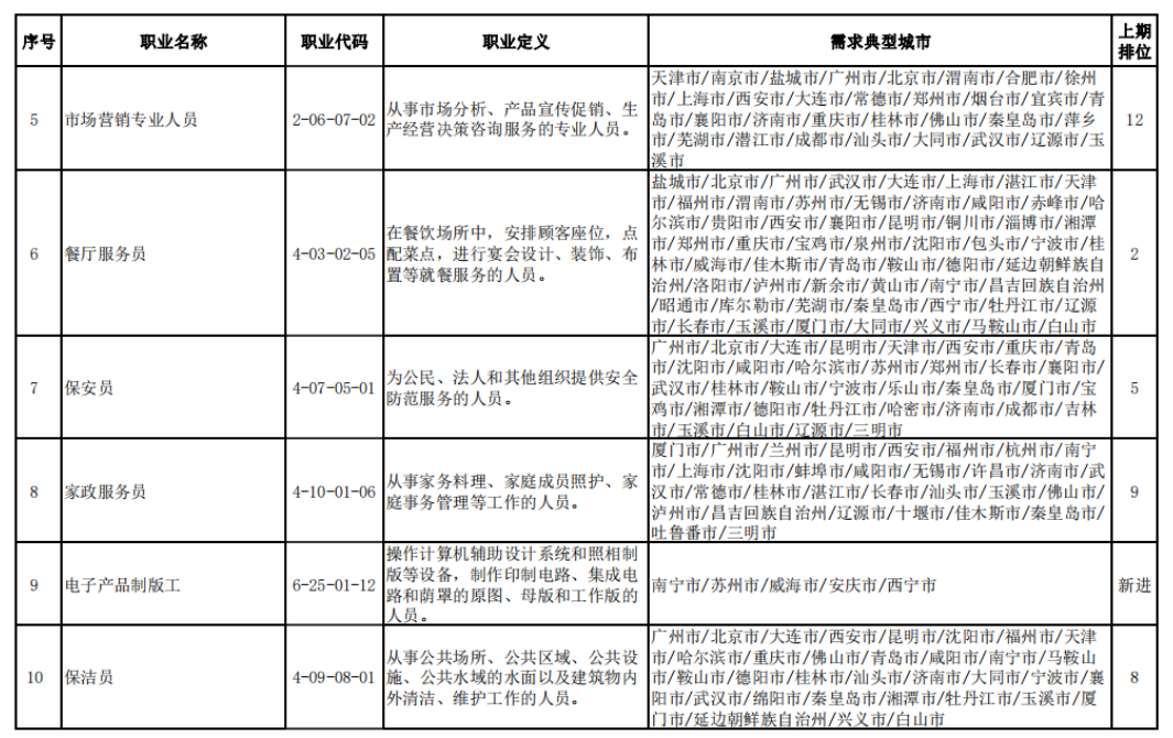 前十位职业分别为营销员、快递员、车工、商品营业员、市场营销专业人员、餐厅服务员、保安员、家政服务员、电子产品制版工、保洁员。