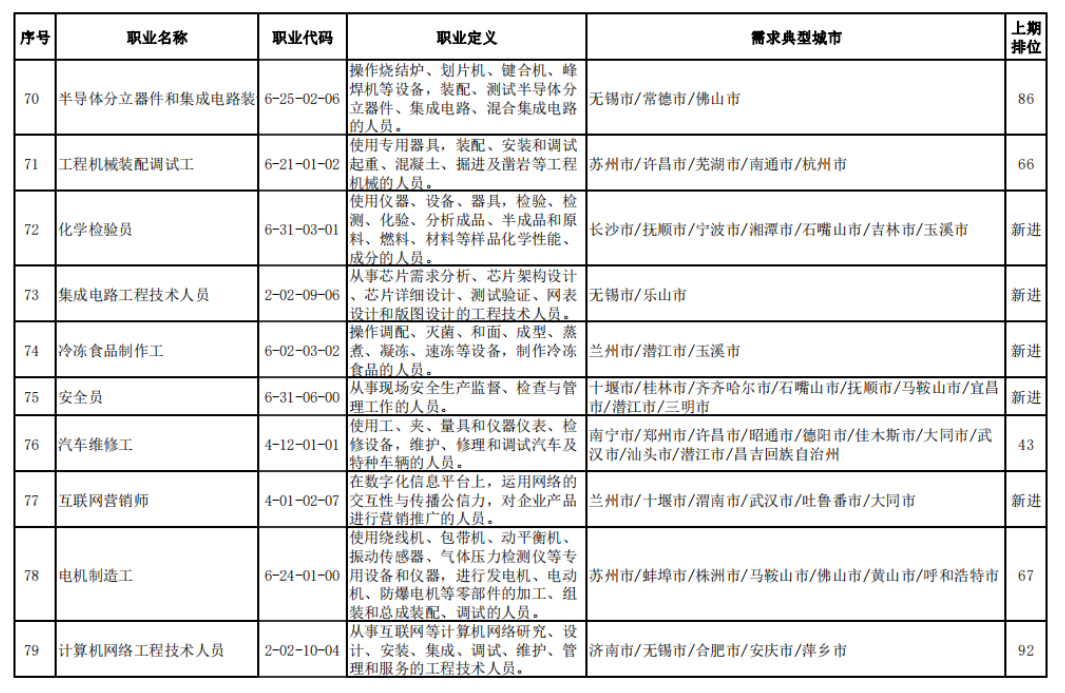 与2022年第一季度相比,招聘需求和求职人数持续回升,制造业缺工状况持续,电子信息产业缺工情况较为突出,“集成电路工程技术人员”“半导体芯片制造工”“电子仪器与电子测量工程技术人员”等职业新进排行,“半导体分立器件和集成电路装调工”“计算机网络工程技术人员”缺工程度加大,“电子产品制版工”进入排行“前十”,位列第9。