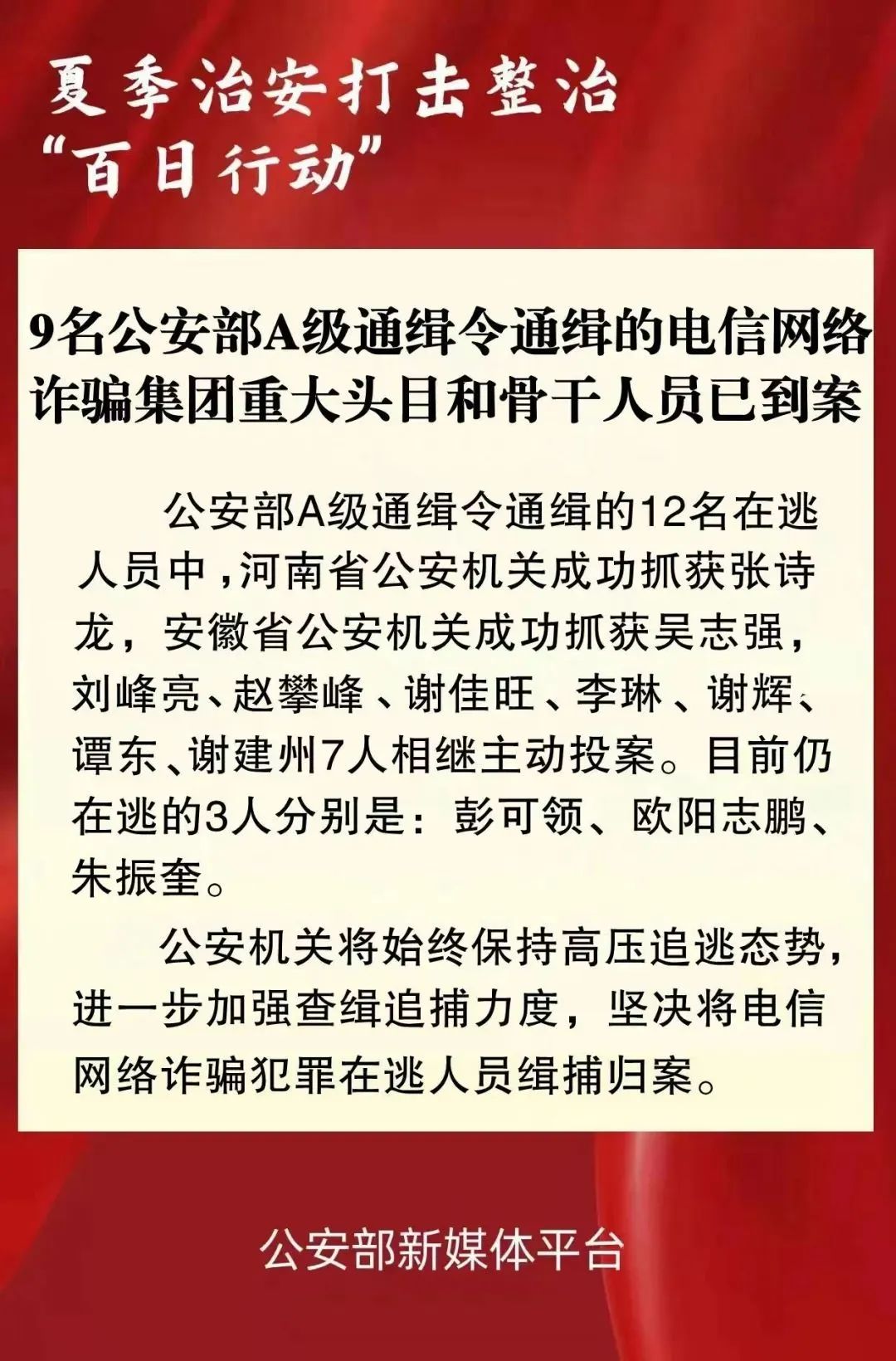 夏季治安打击整治“百日行动”开展以来,全国公安机关按照“拔钉”行动有关部署,重拳出击、多措并举,全力缉捕电信网络诈骗犯罪集团重大头目和骨干人员。截至目前,公安部A级通缉令公开通缉的12名电信网络诈骗集团重大头目和骨干人员中已有9人到案。