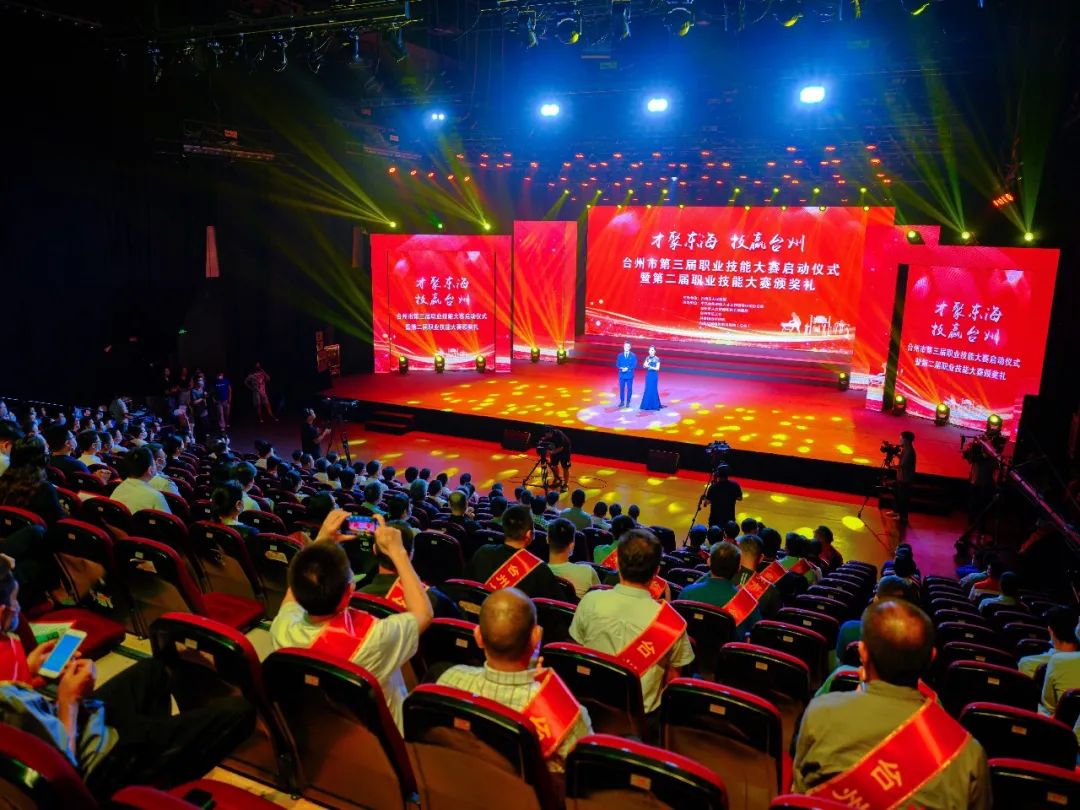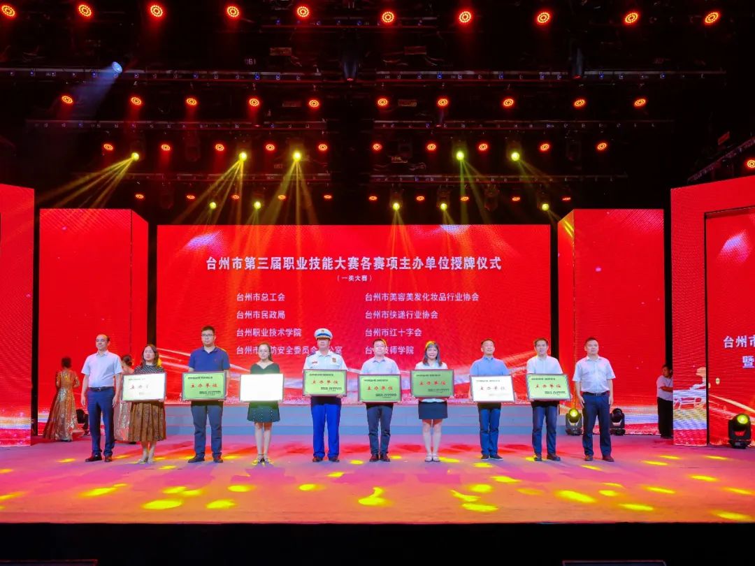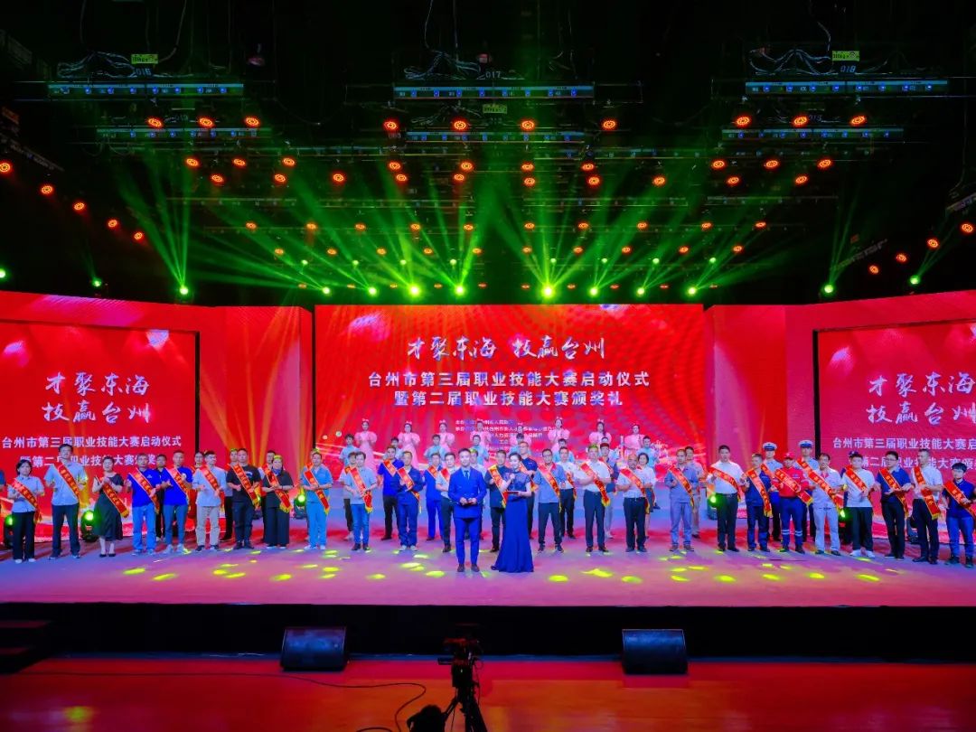 授牌仪式过后,现场嘉宾共同上台将杯中的金沙注入启动台,省技能型社会建设试点正式启动,台州市第三届职业技能大赛正式开启。