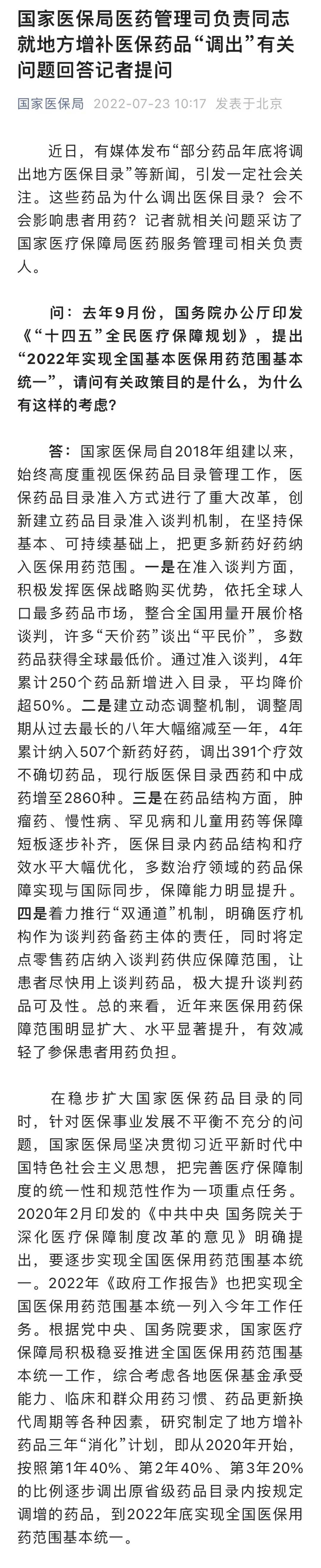 国家医保局微信公众号7月23日发布消息:近日,有媒体发布“部分药品年底将调出地方医保目录”等新闻,引发一定社会关注。这些药品为什么调出医保目录?会不会影响患者用药?记者就相关问题采访了国家医疗保障局医药服务管理司相关负责人。