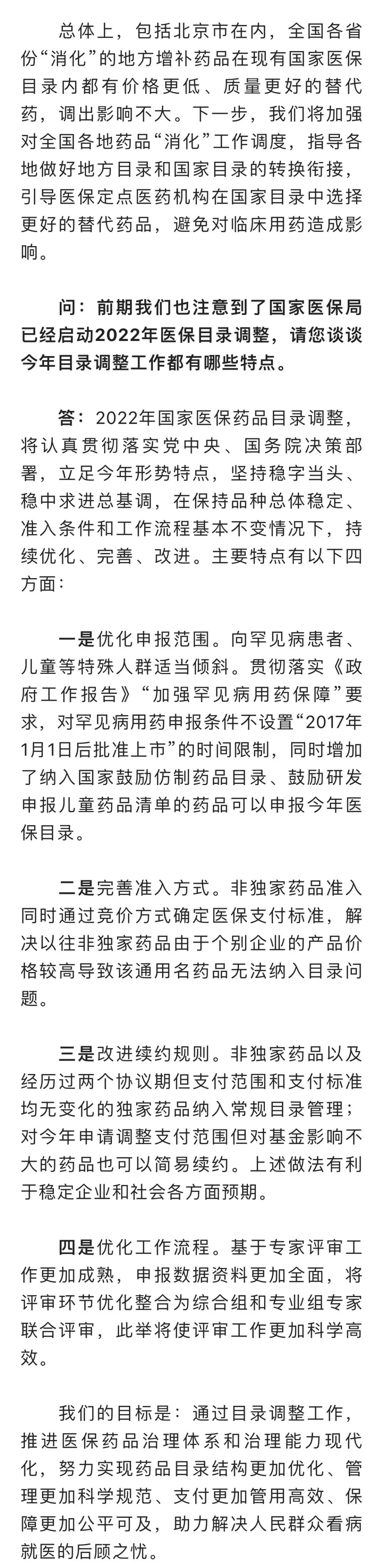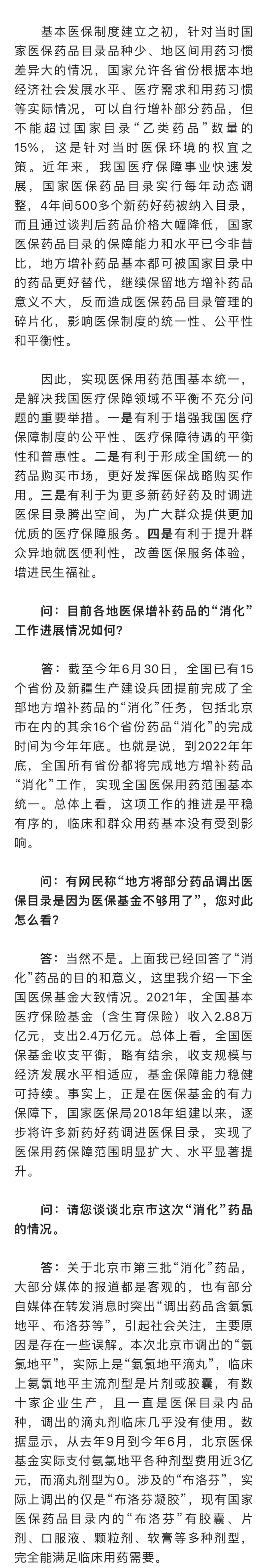 对于有网民称“地方将部分药品调出医保目录是因为医保基金不够用了”,相关负责人回应称,当然不是。2021年,全国基本医疗保险基金(含生育保险)收入2.88万亿元,支出2.4万亿元。总体上看,全国医保基金收支平衡,略有结余,收支规模与经济发展水平相适应,基金保障能力稳健可持续。事实上,正是在医保基金的有力保障下,国家医保局2018年组建以来,逐步将许多新药好药调进医保目录,实现了医保用药保障范围明显扩大、水平显著提升。