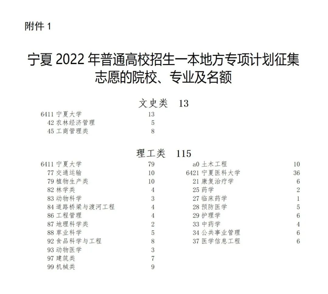 宁夏2022年普通高校招生一本地方专项计划征集志愿的院校、专业及名额