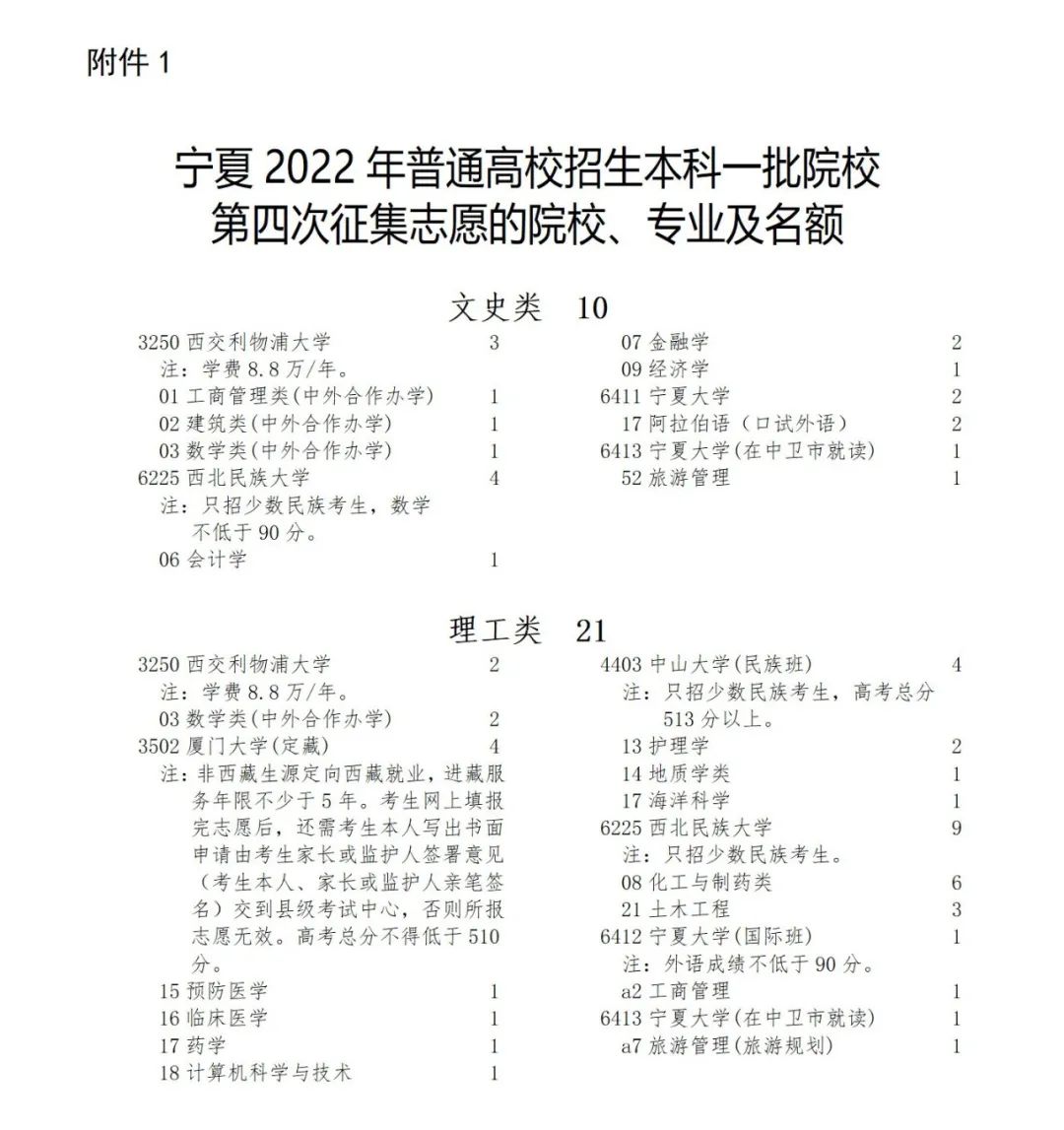 宁夏2022年普通高校招生本科一批院校第四次征集志愿通告