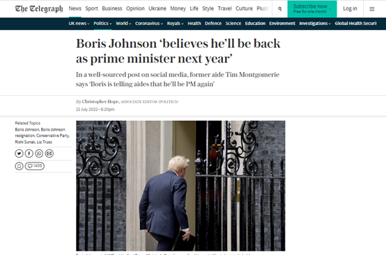 据报道,约翰逊的前助手、现在对他持批评态度的蒂姆•蒙哥马利说,与约翰逊关系密切的消息人士告诉他,约翰逊确信自己会回归。蒙哥马利在社交媒体上发文称:“鲍里斯告诉助手们,他将在一年内再次出任首相。”