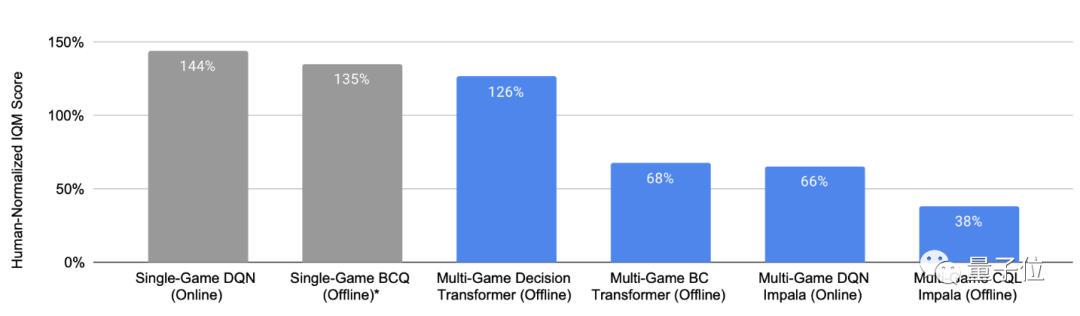 该多游戏智能体玩41款游戏的表现综合得分,是DQN等其他多游戏智能体的2倍左右,甚至可以和只在单个游戏上训练的智能体媲美。