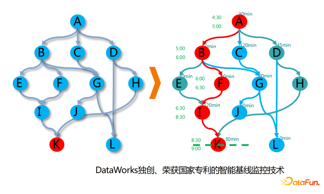 阿里巴巴每天有千万级大数据计算任务产生海量数据,千万级任务的调度情况下,调度依赖关系复杂程度远超过人工处理程度,阿里推出了智能基线监控机制确保高优先任务高保障产出。