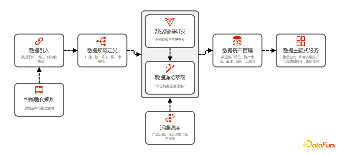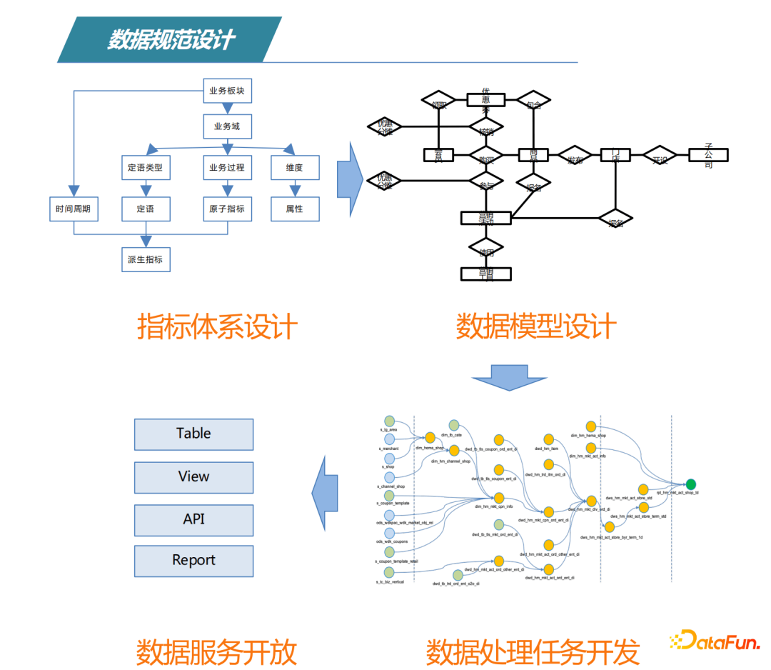 数据在实现层面以表为单位进行,阿里巴巴围绕数据生产使用全生命周期,在指标体系设计、数据模型设计、数据处理任务开发、数据服务开放等环节的每个关键阶段都设计具体标准、流程及规范,同时抽象核心公共层,进行强管控:架构评审,发布管控,建设评估,持续改进。而对核心以外的部分,采取轻约束的方式推进。