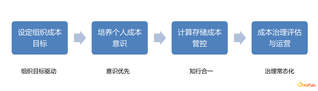 通过设立组织大的成本目标,然后通过培养个人的成本意识,在数据的计算与存储、治理与运营层面建立具体目标去细化和落地,来推进数据治理方面的成本管理。比如阿里巴巴2020年成本治理的目标:数据成本增速不能超过业务增速。