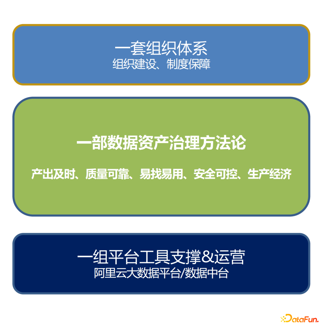 阿里构建了以数据管理团队负责人、业务线数据负责人、数据平台负责人为核心的虚拟数据治理小组,从组织上划分清洗数据治理的权责边界, 并且从管理办法、管理流程、技术规范及模板等建立起完整的数据治理制度保障。