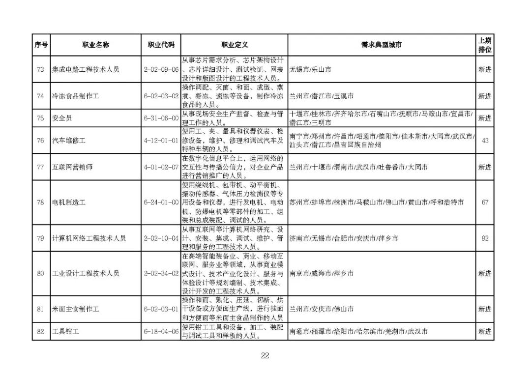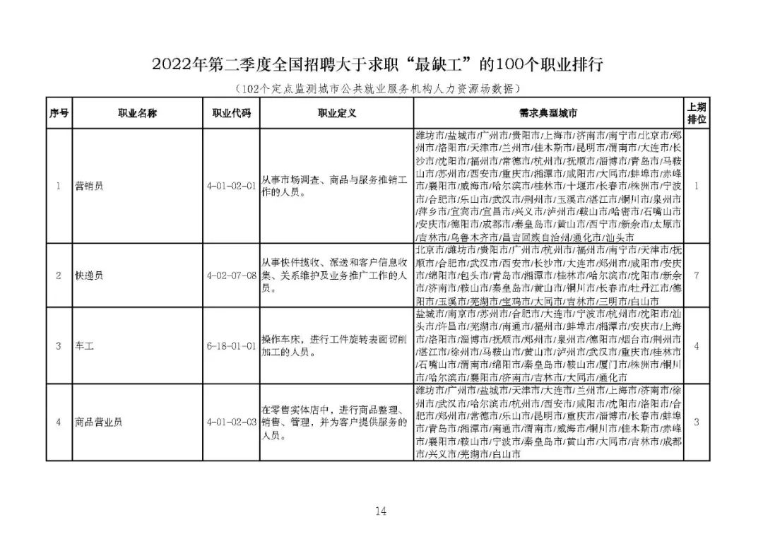 人力资源和社会保障部22日发布2022年第二季度全国“最缺工”的100个职业排行。其中,营销员、快递员、车工、商品营业员、市场营销专业人员、餐厅服务员、保安员、家政服务员、电子产品制版工、保洁员等职业位列前十。
