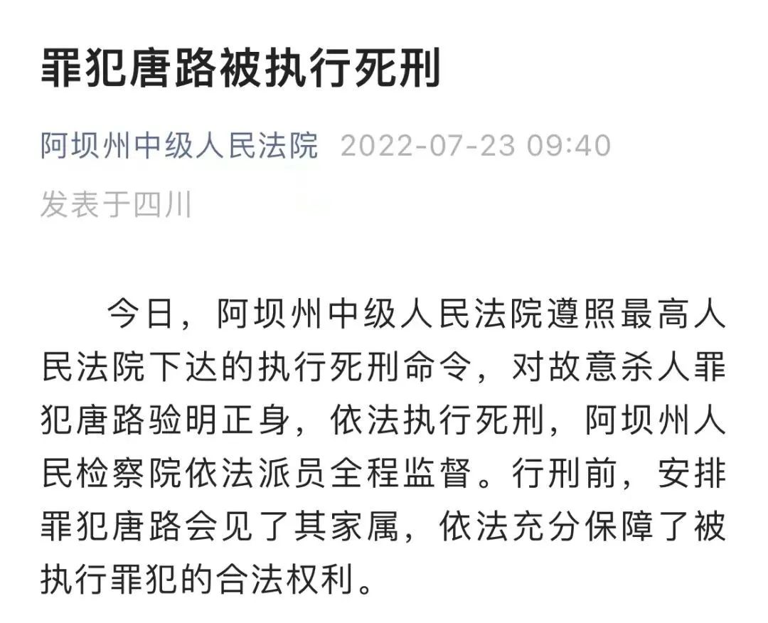 据四川阿坝州中级人民法院消息:今日,阿坝州中级人民法院遵照最高人民法院下达的执行死刑命令,对故意杀人罪犯唐路验明正身,依法执行死刑,阿坝州人民检察院依法派员全程监督。行刑前,安排罪犯唐路会见了其家属,依法充分保障了被执行罪犯的合法权利。