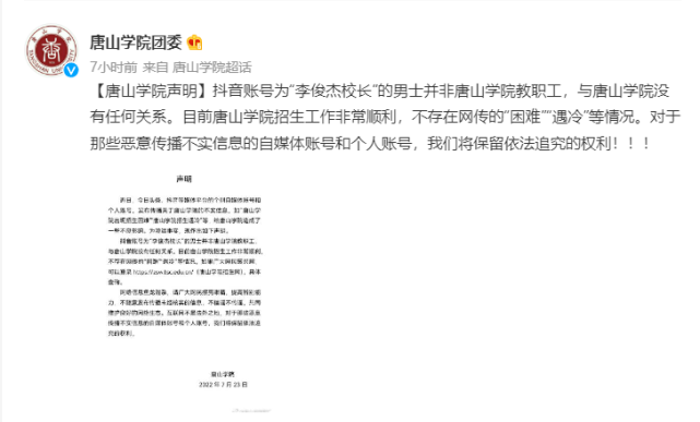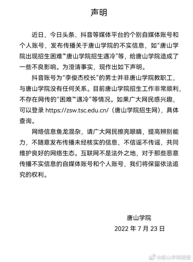 唐山学院:目前招生工作不存在网传的困难、遇冷等情况