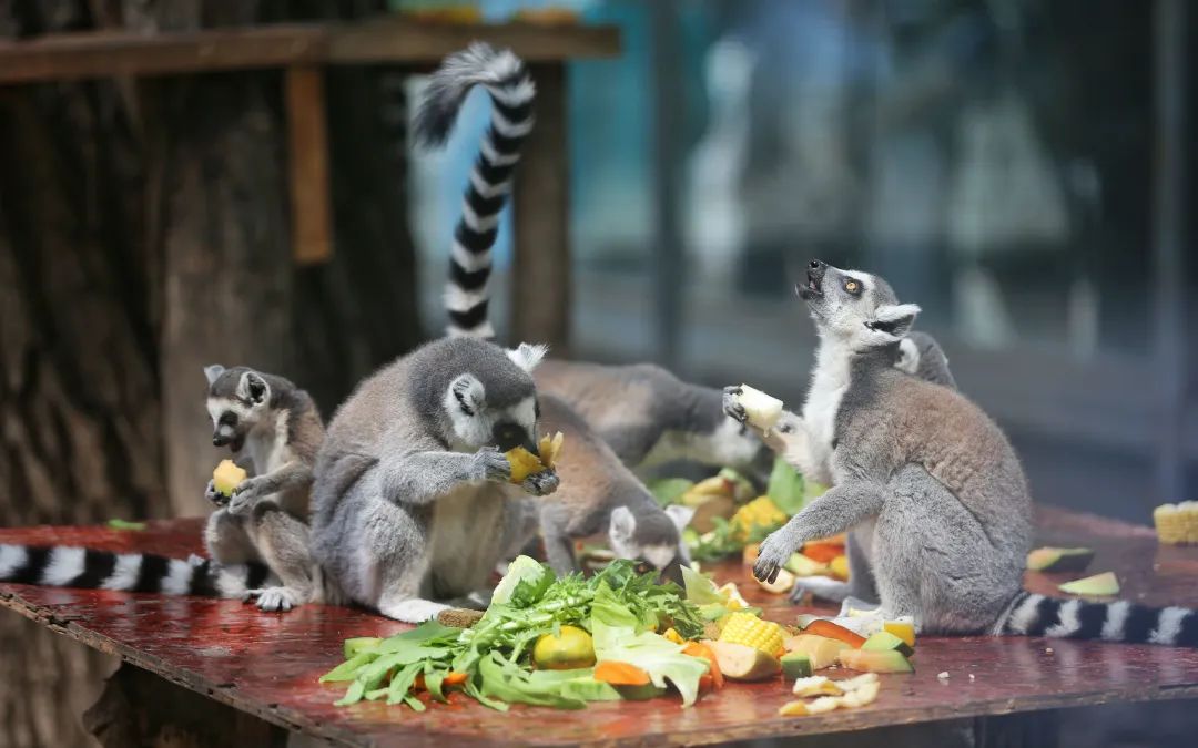 每天10点,游客能看到环尾狐猴家族聚在一起分享哈密瓜、桃子、玉米等果蔬。据悉,杂食动物的水果、蔬菜会随着季节而调整,尽量采用应季新鲜果蔬。存储的苹果更换为新鲜上市的大桃,木瓜更换为绿宝瓜,同时增加鲜杏、西兰花、豇豆、青椒、西红柿等应季果蔬。