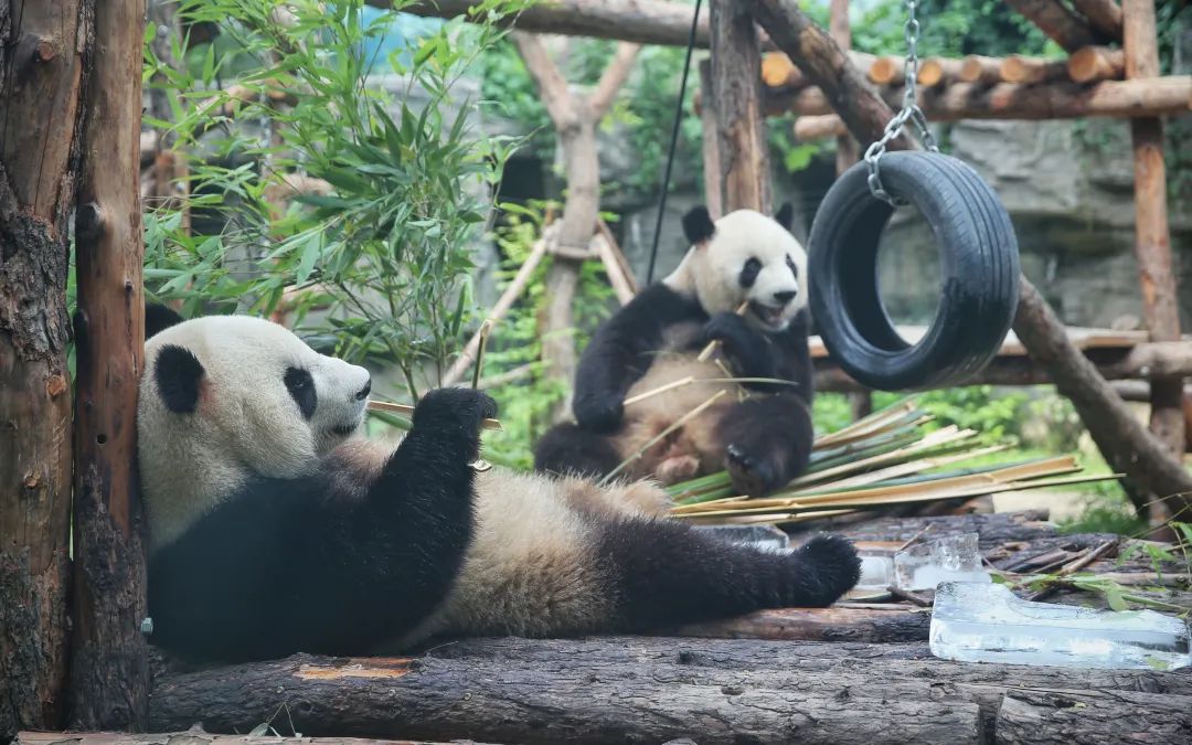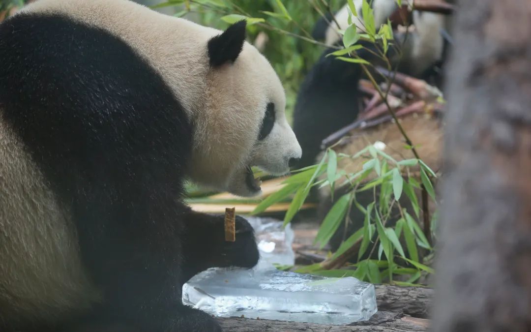 大熊猫一来到室外玩耍,就直奔摆着竹子和冰块的平台。它们将脚丫搭在冰块上,憨态可掬的模样吸引游客纷纷拍照。据悉,今年北京动物园新引进了制冰设备,相比人工制冰,机器更加快速高效。
