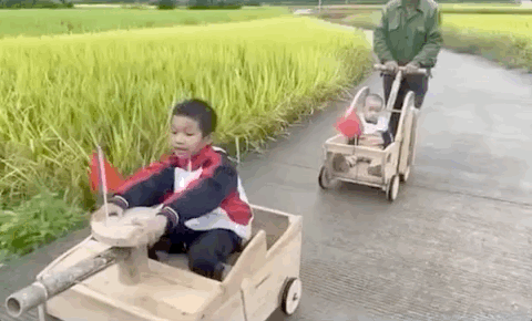 当家人推着它去遛娃,一岁半的小孙子蛋蛋顿时就成了全村“最靓的仔”。