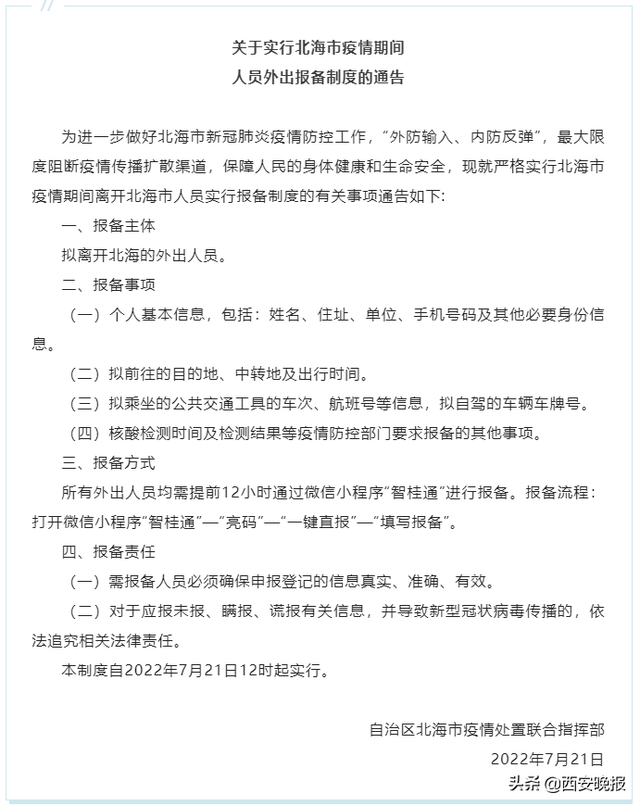 广西北海市疫情处置联合指挥部2022年7月21日发布通告,为进一步做好北海市新冠肺炎疫情防控工作,“外防输入、内防反弹”,最大限度阻断疫情传播扩散渠道,保障人民的身体健康和生命安全,现就严格实行北海市疫情防控期间离开北海市人员实行报备制度的有关事项通告如下: