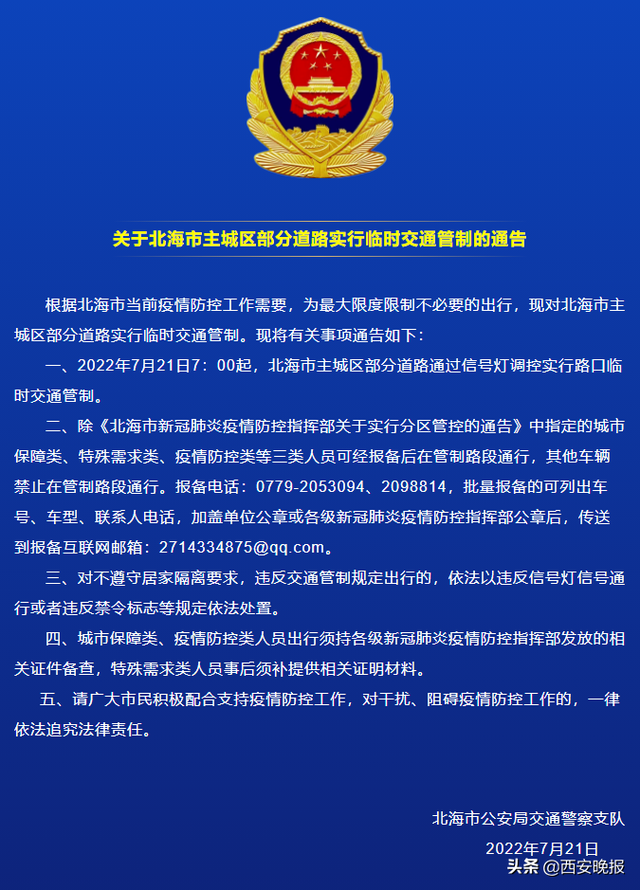 据“北海政法”公众号今日消息,根据广西北海市当前疫情防控工作需要,为最大限度限制不必要的出行,现对北海市主城区部分道路实行临时交通管制。现将有关事项通告如下: