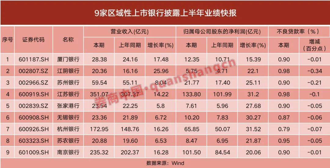 截至7月20日,已有9家区域性上市银行披露上半年业绩快报,其亮眼的业绩增速也给市场注入了一剂“强心剂”。