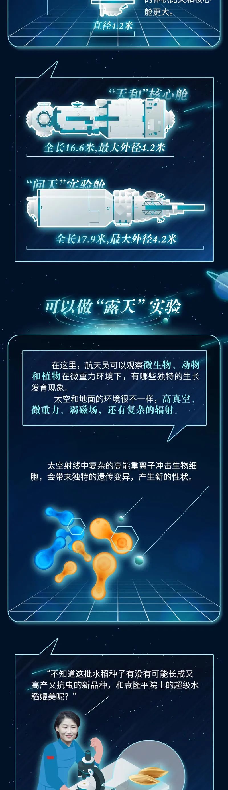 与天和核心舱相比,问天实验舱更重、更大,具备更强的超万瓦级的供电能力、千兆级的信息传输能力。作为航天员未来在空间站内进行空间生命科学研究的主要基地,问天实验舱的工作舱也更为宽敞,舱内配置了多台科学实验柜,将推动我国在生命生态、生物技术和变重力科学等科技领域的相关研究。