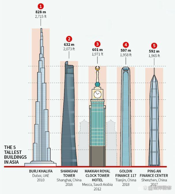 在中东地区,一些因石油兴起的土豪国家,阿联酋、沙特和卡塔尔也纷纷加入摩天大楼建设阵营,其中,阿联酋迪拜2010年建成的哈利法塔总高度达828米,至今一直保持全球最高摩天大楼记录,预计在今后相当长的一段时间内,这个纪录无法撼动。
