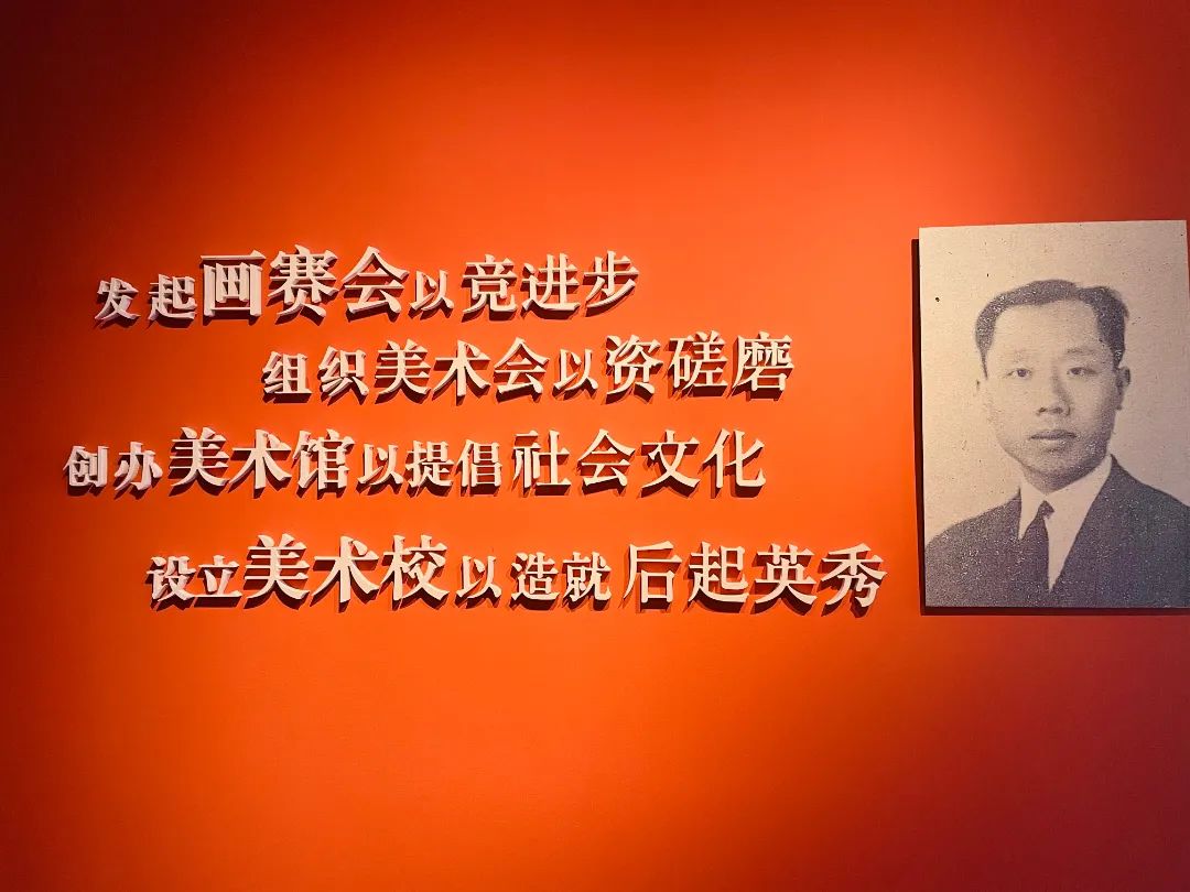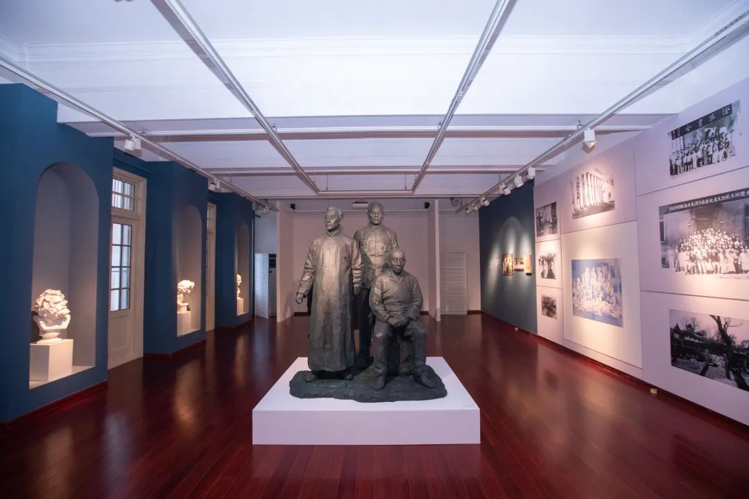 “君看沧浪节劲雄——颜文樑与苏州美专文献展”现场,雕塑是三位创办人。