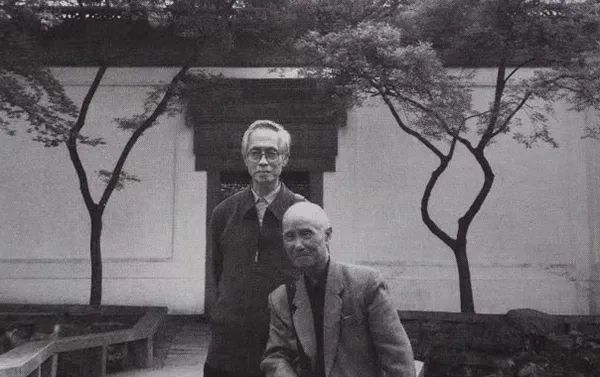 2007年4月7日,薛企荧(左)与校友罗尔纯(1930-2015)摄于苏州沧浪亭。澎湃新闻资料图。