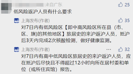 尊敬的用户,您好!如您当前不在沪且有7天内国内中高风险区旅居史,建议您暂缓来沪返沪。确需来沪返沪,请到沪12小时内向所在社区、单位或所住宾馆,及时告知情况。对来自或途经国内疫情高风险区人员,将落实7天集中隔离医学观察措施和5次核酸检测;对来自或途经国内疫情中风险区人员,落实7天居家隔离医学观察措施和3次核酸检测。