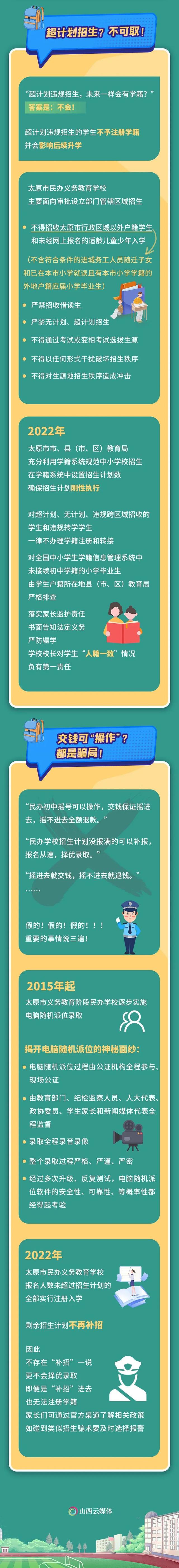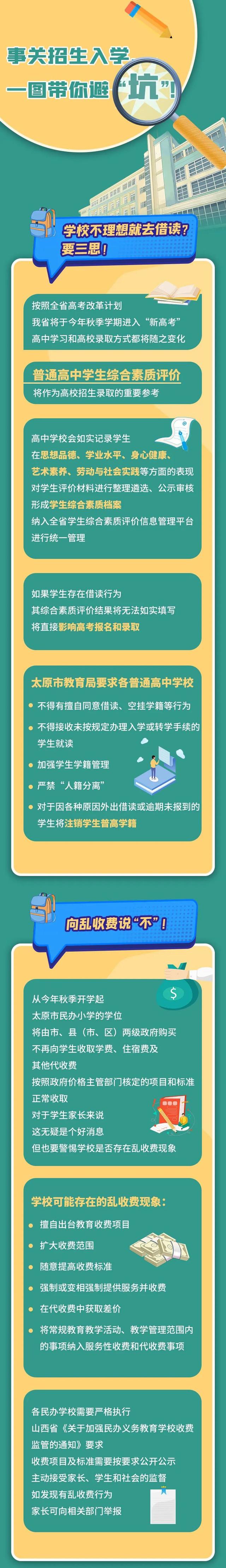 目前,太原市义务教育阶段招生入学工作以及中考录取工作正在进行,“上学”已经成为这段时间的热点词汇。随着今年全省高考新政的实施,以及中小学招生入学政策的调整变化,不少家长们还存在误区。7月19日,太原市教育局印发《关于进一步规范中小学招生工作的通知》,对太原市中小学招生工作进行了进一步规范。