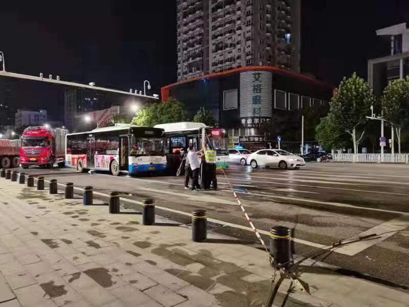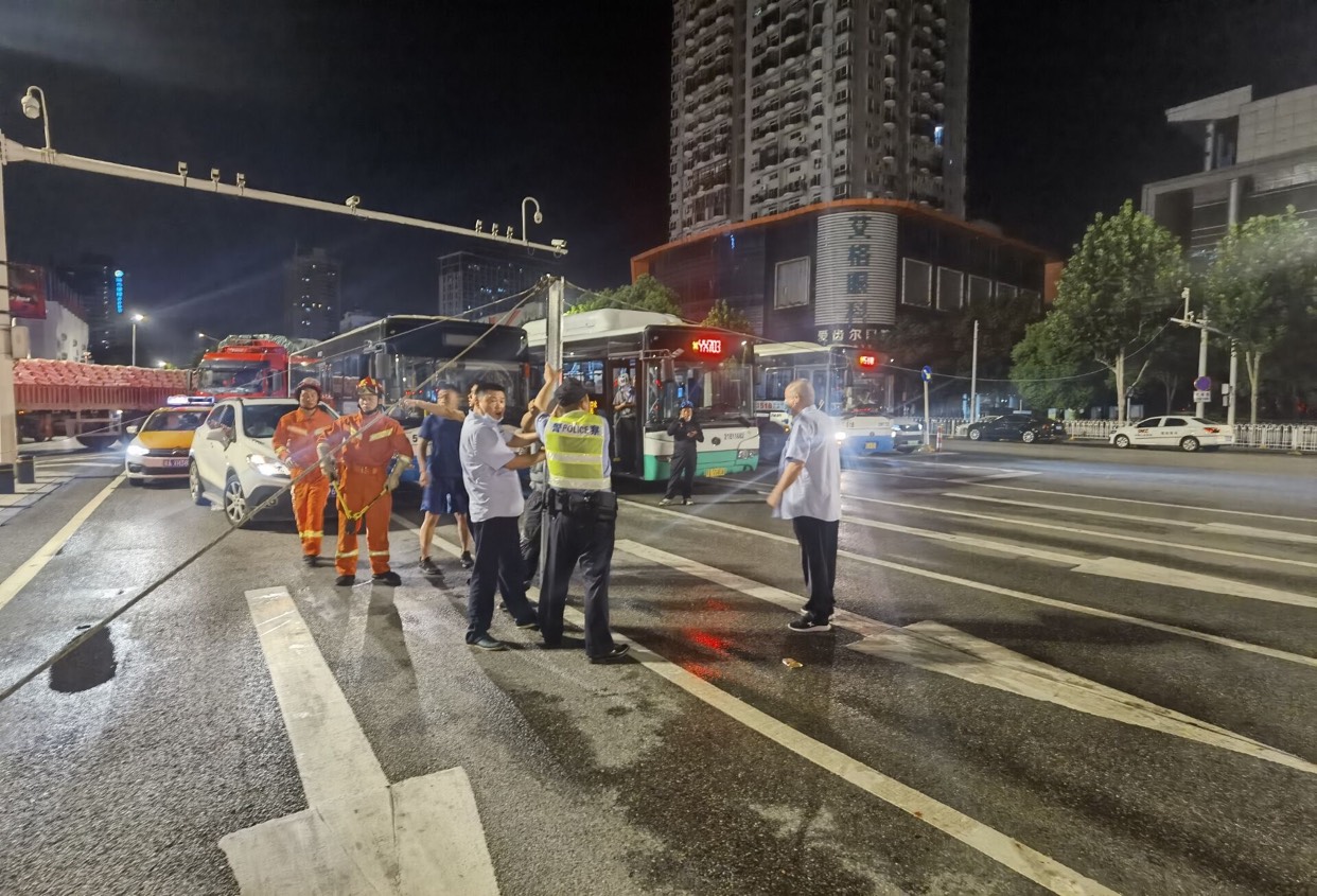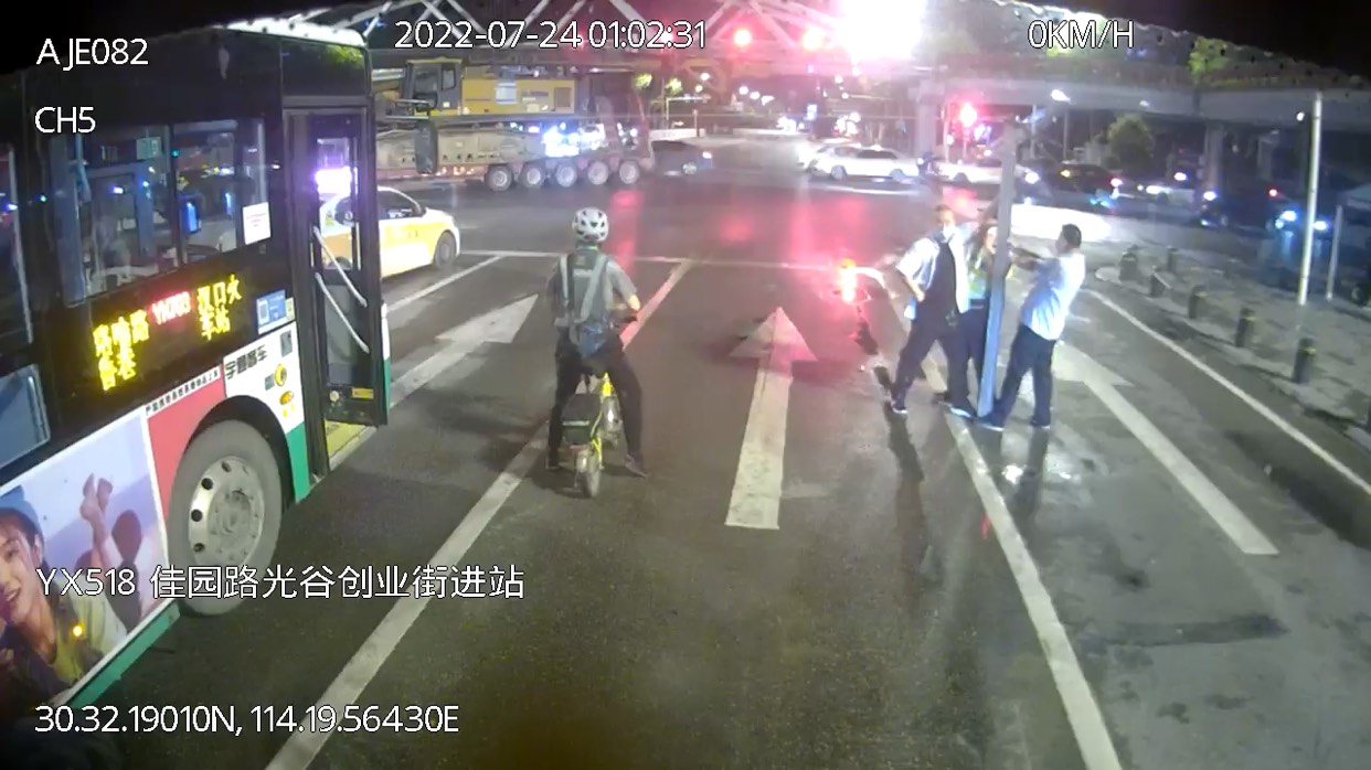 7月24日00时43分,武汉公交YX518路司机张勇驾驶1721号车从佳园路光谷创业街开往武昌火车站综合体途中,行驶至武珞路与中南路交汇T字路口时,道路上方因一辆平板大货车装载的挖掘机超高,挂断路口电缆线掉落下来在半空中,导致路口车辆都无法通行。