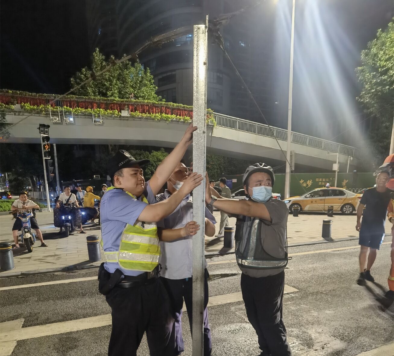 张勇立即临时停车上前查看,由于公交车车身太高无法通过该路段,并伸手托举起电缆线让车身相对较矮的私家车顺利通过,缓解路口交通拥堵的状况。00时45分,民警赶到事发现场,同张勇一起托举起电缆。00时51分,经过此处的公交YX703路1681号车司机江威也加入到托举的行列中,民警则找来一根金属杆作为支撑,将挂断的电缆架起托举,但因金属杆无法固定,张勇和民警将金属杆用手扶住,以免电缆再次掉落,对过往车辆造成二次伤害。01时19分,接警后的消防应急队员赶到现场,经过处理后道路于2分钟后恢复畅通。01时22分,张勇回到车上继续运营。