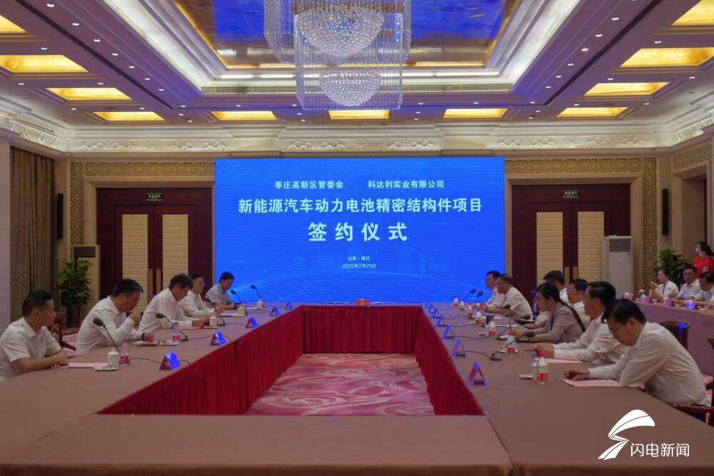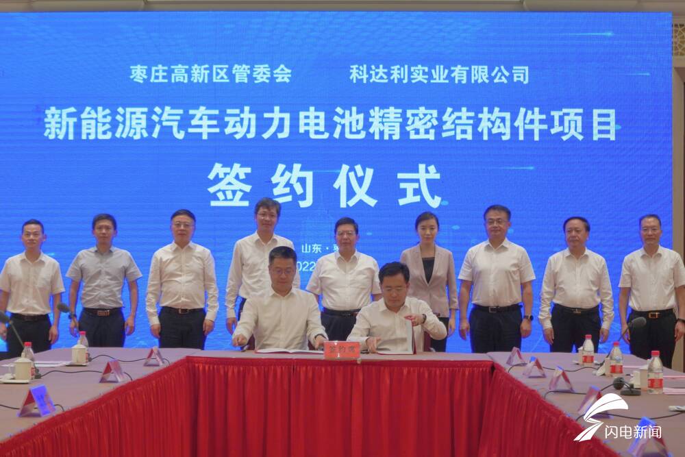 齐鲁网·闪电新闻7月24日讯 7月23日下午,枣庄开元凤鸣山庄宴会厅气氛热烈,由世界新能源企业500强、中国锂电产业50强企业深圳科达利实业股份有限公司投资建设的新能源汽车动力电池精密结构件项目签约仪式在这里如期举行。