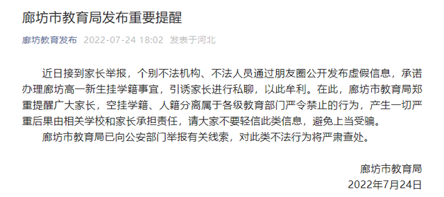 近日接到家长举报,个别不法机构、不法人员通过朋友圈公开发布虚假信息,承诺办理廊坊高一新生挂学籍事宜,引诱家长进行私聊,以此牟利。在此,廊坊市教育局郑重提醒广大家长,空挂学籍、人籍分离属于各级教育部门严令禁止的行为,产生一切严重后果由相关学校和家长承担责任,请大家不要轻信此类信息,避免上当受骗。