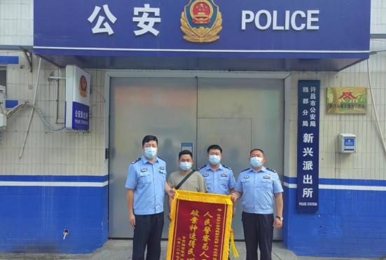 7月23日9时许,许昌市公安局魏都分局辖区两名群众一起举着“人民警察为人民、破案神速得民心”锦旗来到许昌市公安局魏都分局新兴派出所,对民警在一天内迅速破案,挽回他们的经济损失表达了发自内心的感谢之情。