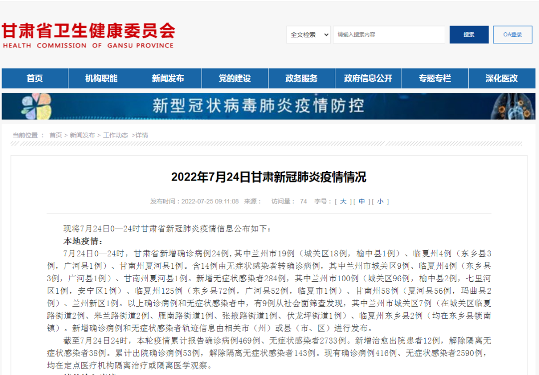 7月24日甘肃新增本土确诊病例24例、无症状感染者284例